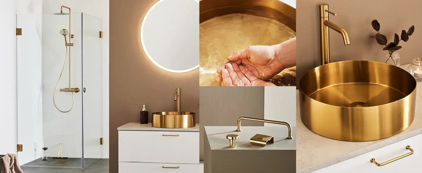 Ota rauhoittava kylpy hämärässä ja anna kynttilän valon lämpimän ehkun rauhoittaa mielesi. Yhdenmukaisilla messinginvärisillä yksityiskohdilla luot ainutlaatuisen, mutta samalla aistillisen ja lämpimän ilmapiirin kylpyhuoneeseesi.