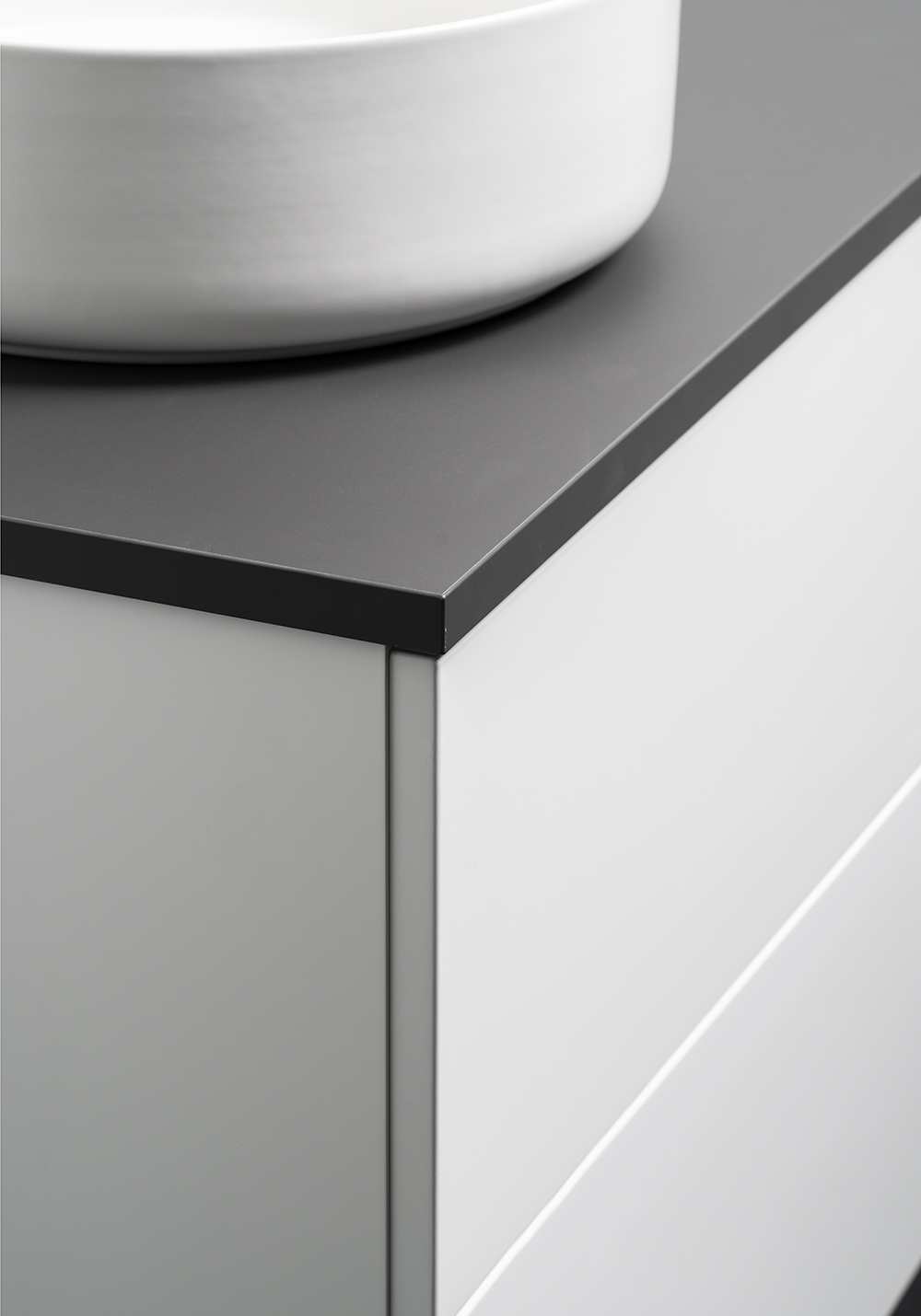OnTop pöytätaso laminaattia. Värillä antrasiitti on extra matta pinta joka estää sormenjälkiä. Reiät porataan asennusvaiheessa riippuen hanasta ja valitusta allasmallista sekä halutusta sijainnista niille.