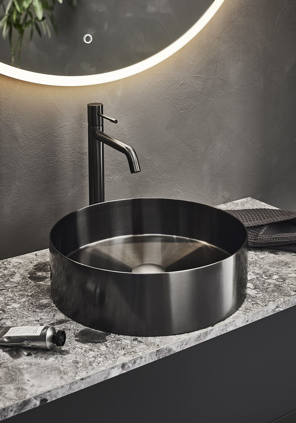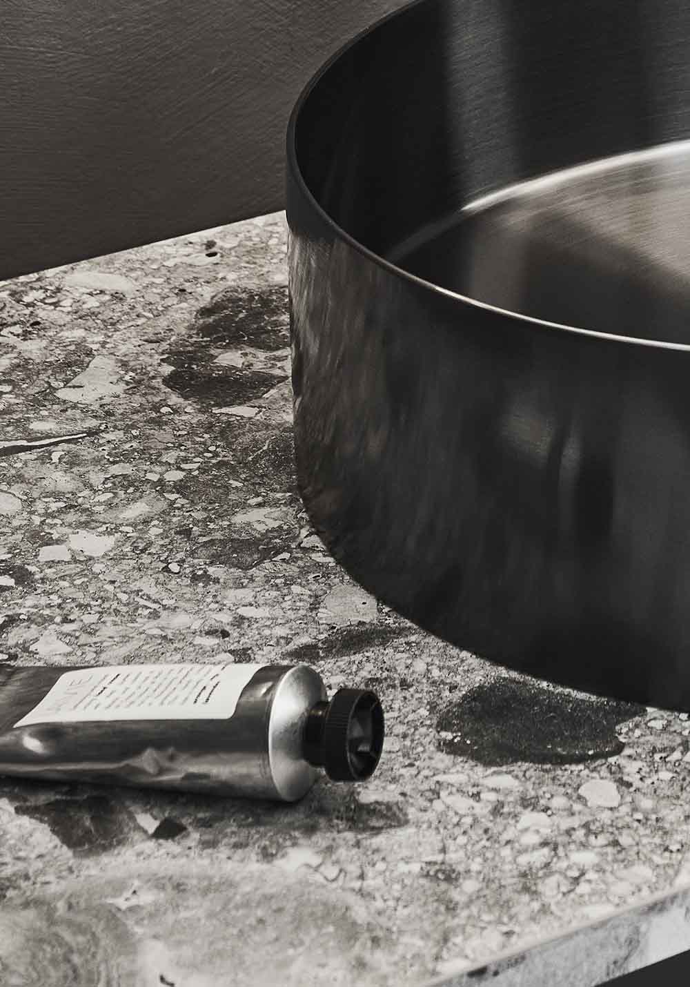 OnTop laminaatti pöytätaso. Harmaa Terrazzo kuvio. Reiät porataan asennusvaiheessa hanalle, altaalle ja niiden sijainnille sopivaksi.
