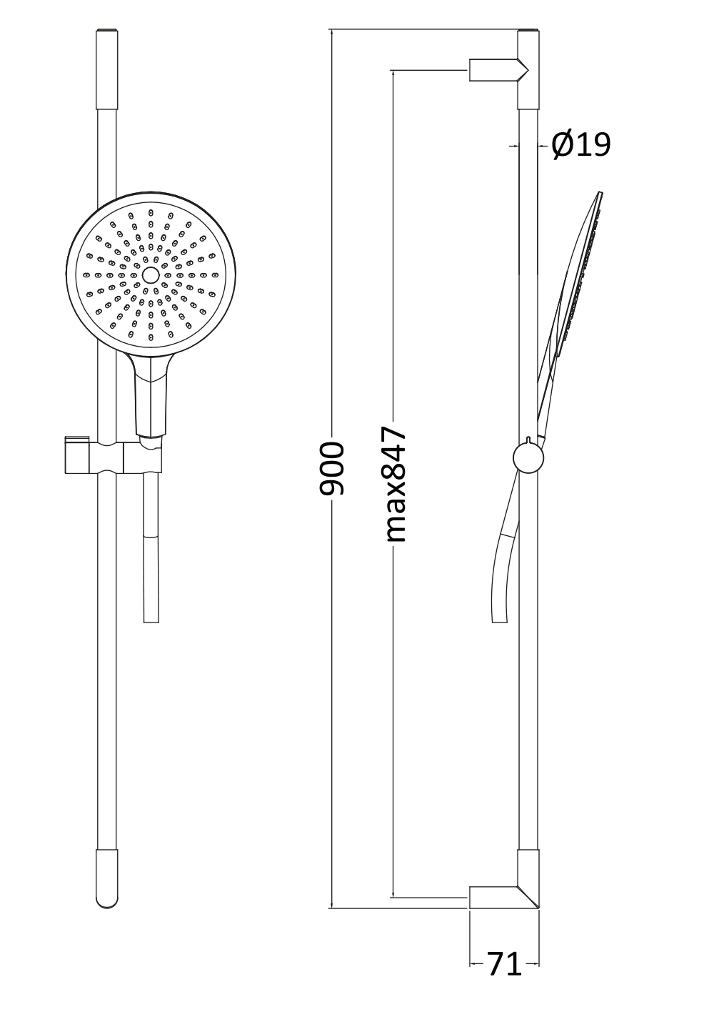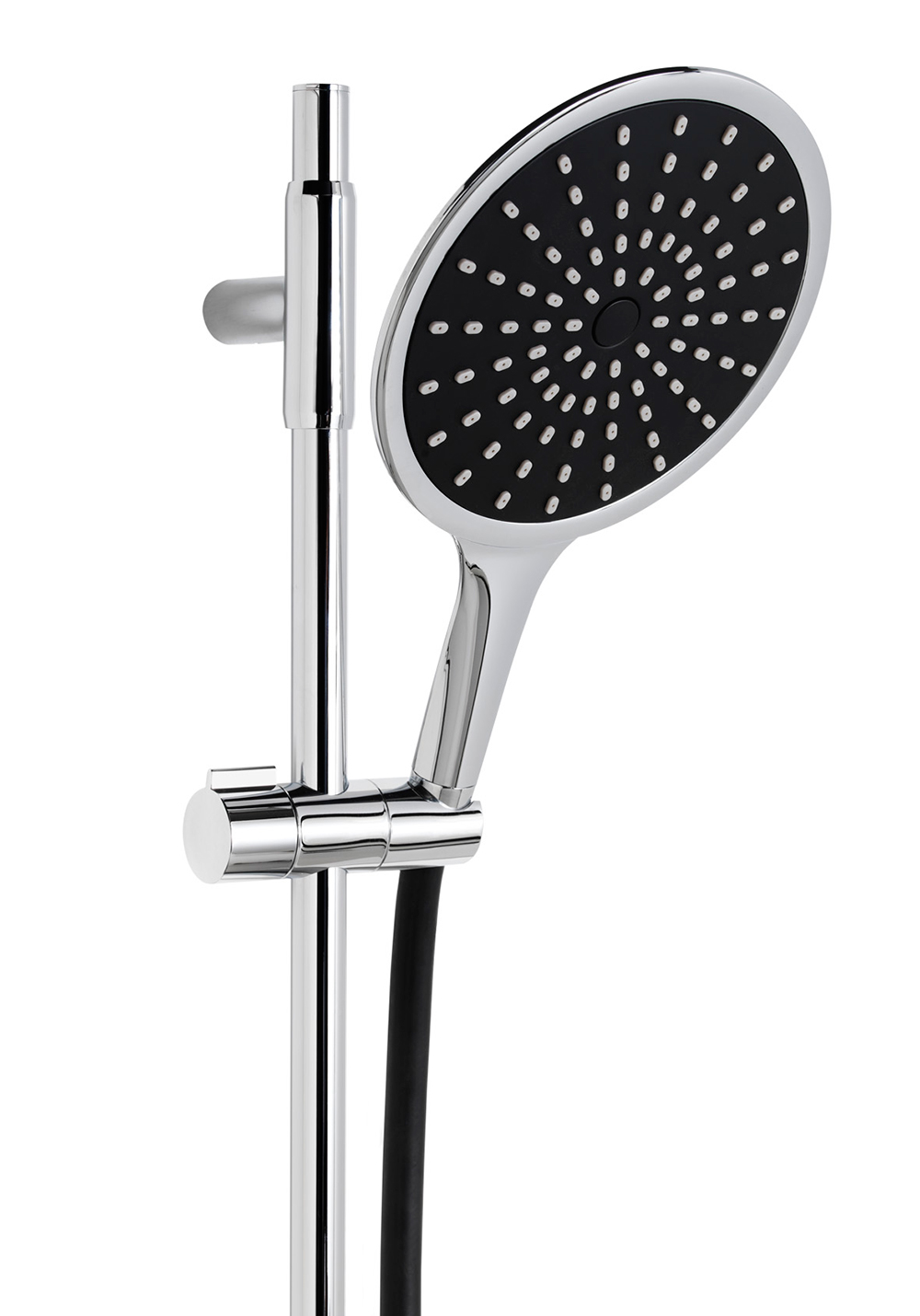 Kromattu suihkusetti jossa on metallitanko, musta letku ja kahva.
