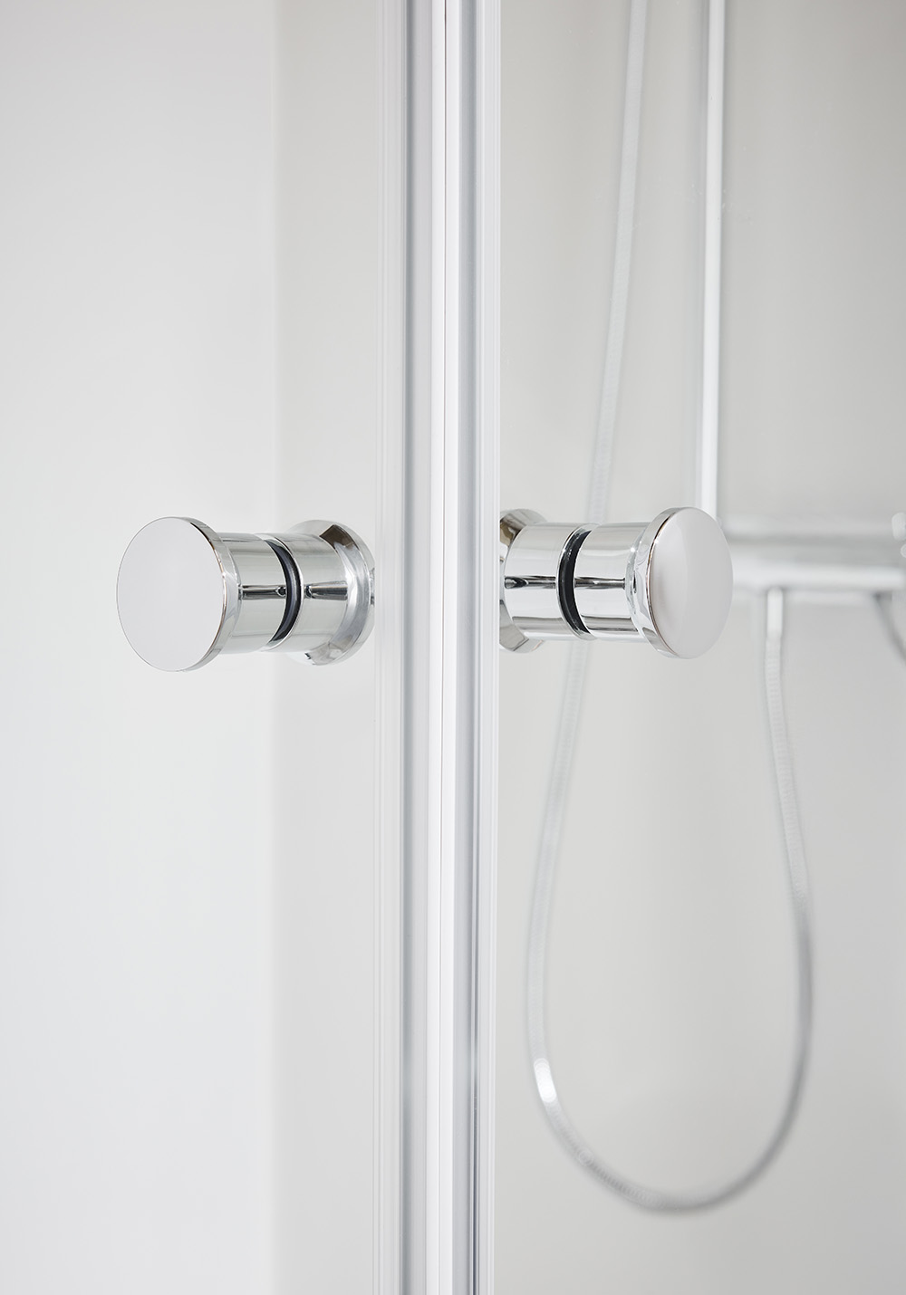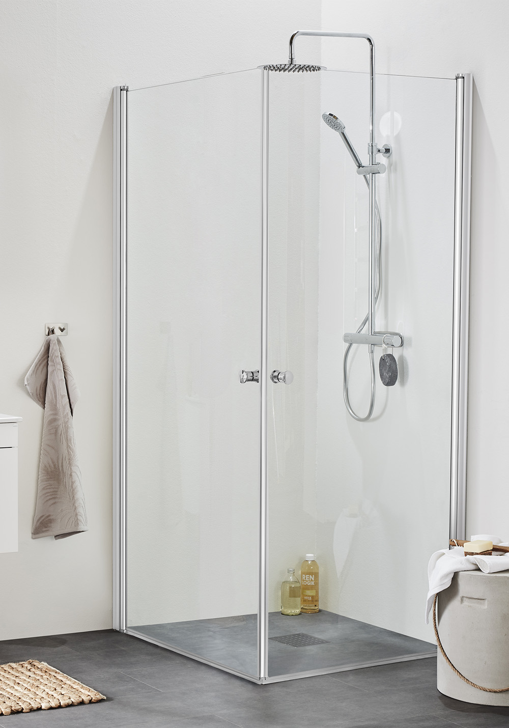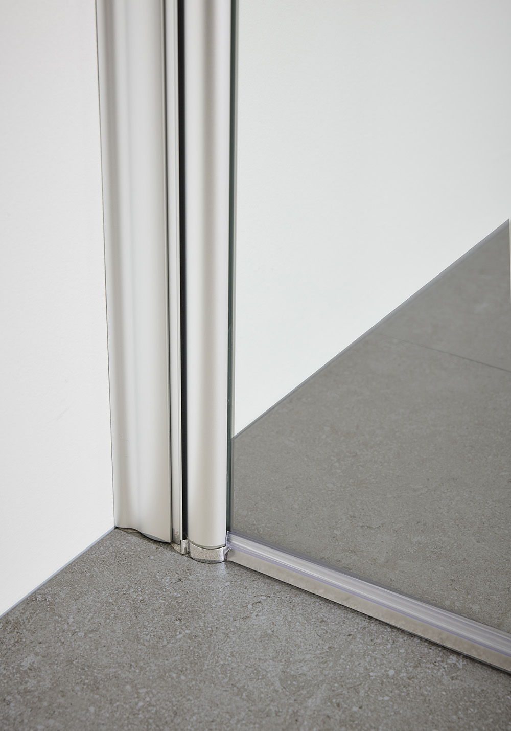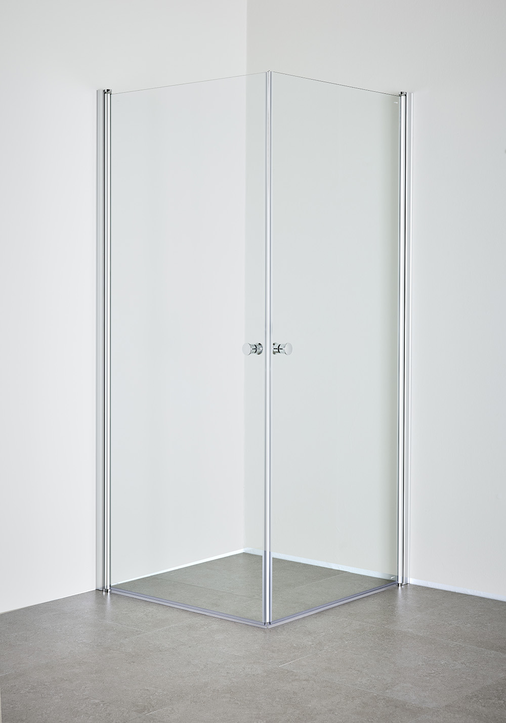 Tilava suihkunurkkaus, jossa on suorat ovet kirkkaasta lasista ja vakaat seinäprofiilit anodisoidusta alumiinista. Säädettävät magneettilistat varmistavat ovien sulkeutumisen tiiviisti. Ovissa on nostosaranat, jotta ne eivät kosketa lattiaa avattaessa. Käännettävä. Korkeus 1900 mm ja 5 mm:n karkaistulla turvalasilla. Voidaan asentaa pinta-asennettavilla putkilla, 35 mm. Laahus- ja magneettilistat sekä nupit sisältyvät toimitukseen.