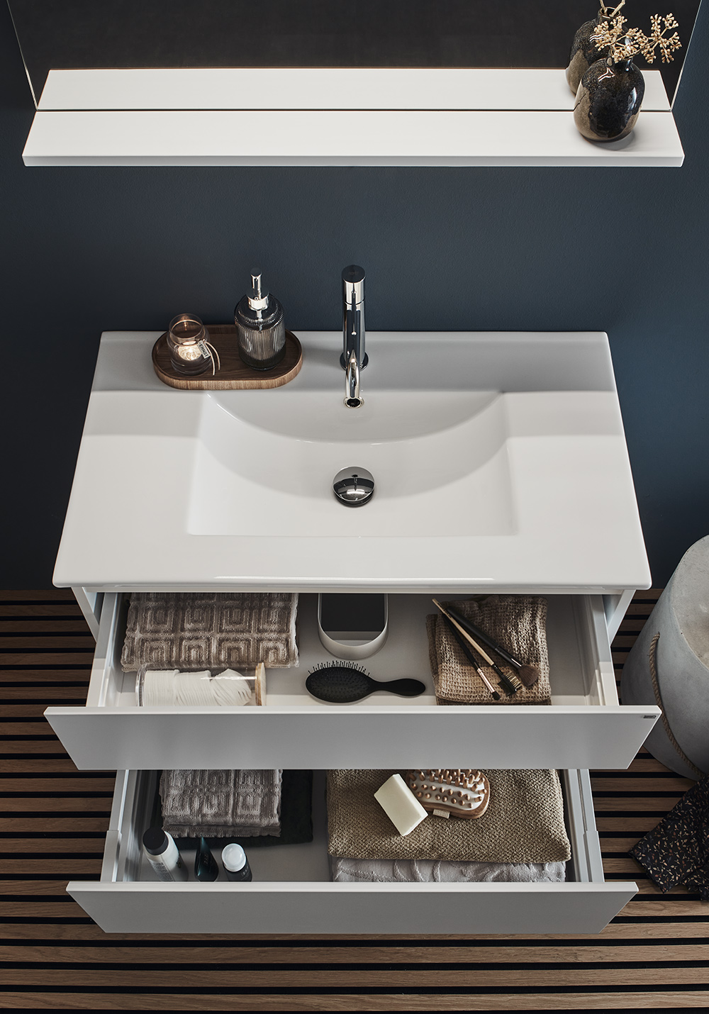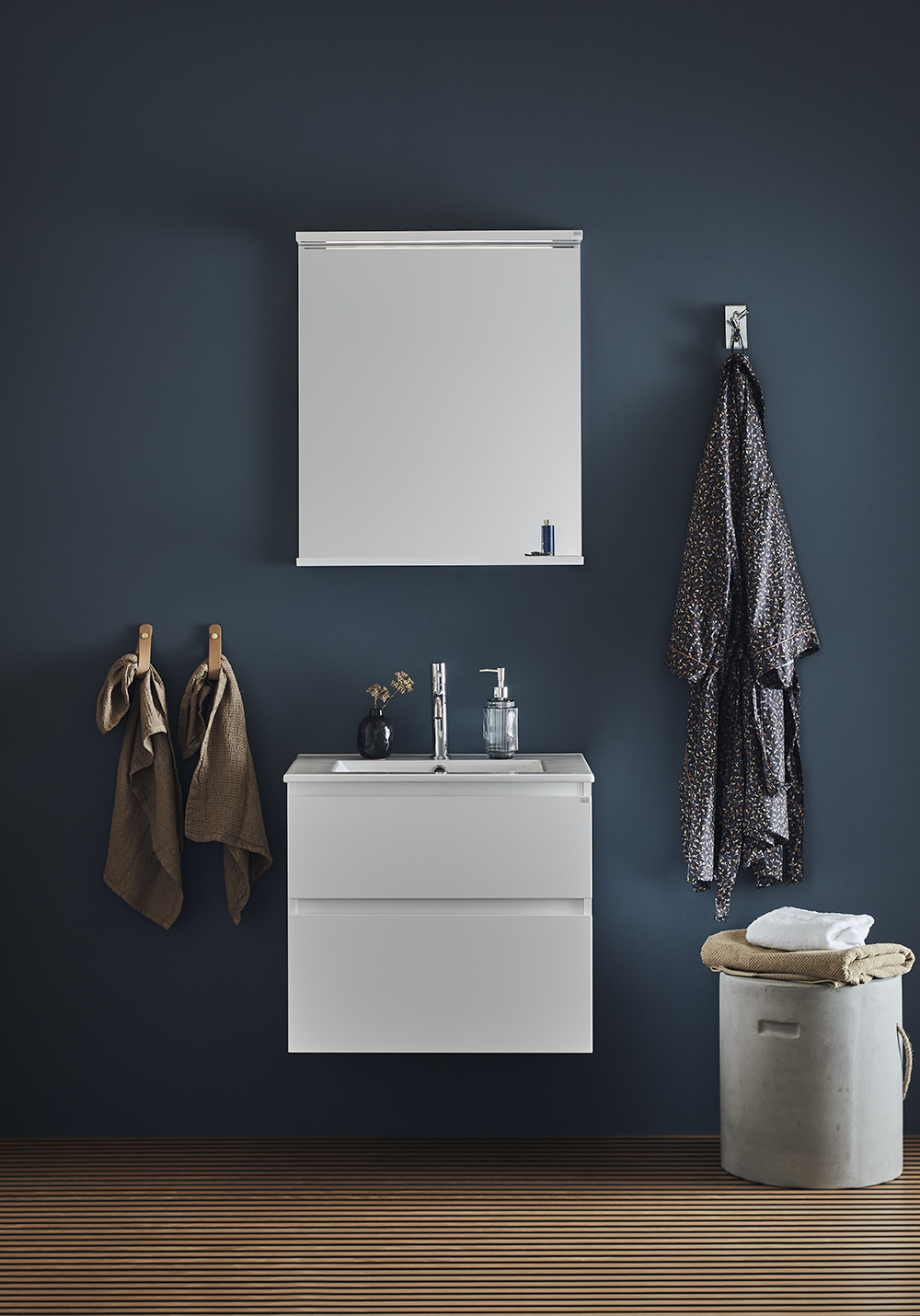 Pesuallaskaappi Hafa Style matta valkoinenon integroiduilla vetimillä, joka antaa kalusteelle tyylikkään muotoilun. Kahdessa pehmeästi sulkeutuvassa laatikossa on laatikkomatot ja laatikot aukeavat kokonaan, joten pääset helposti käsiksi niiden sisältöön. Osta mukaan hana, pohjaventtiili, vesilukko, sähköpistorasia. Allaskaappi on helppo asentaa seinäkiskon ja säädettävien ripustushelojen avulla. Se on myös valmisteltu sekä seinä- että lattiaviemäriä varten.