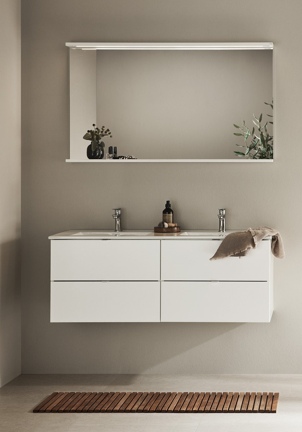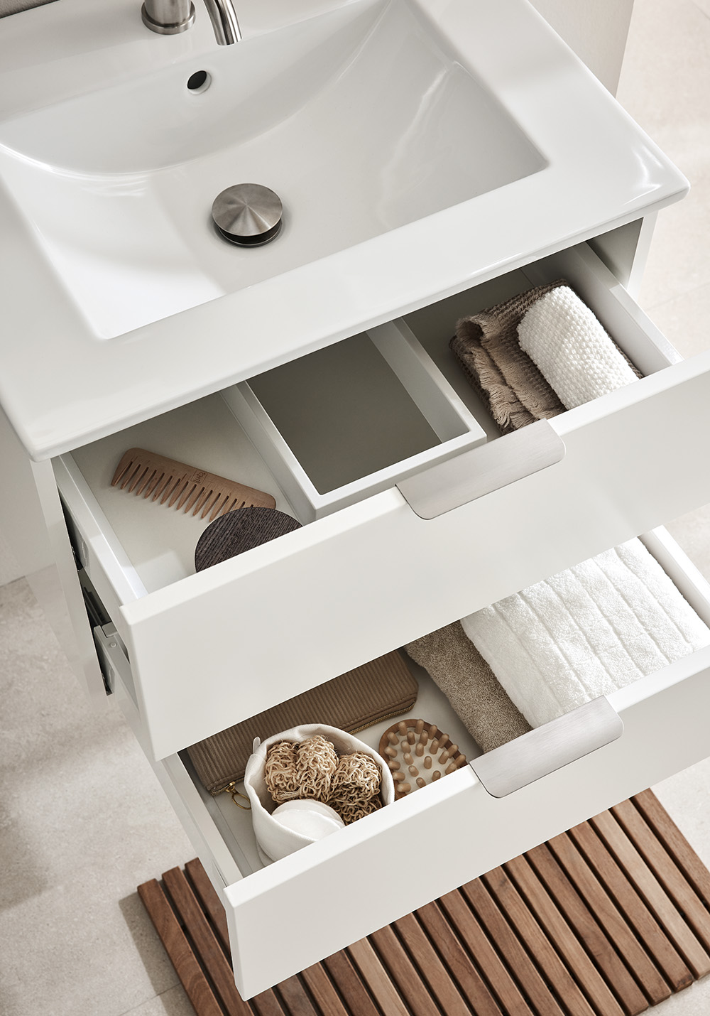 Hafa Go pesuallaskaappi posliini altaalla on käytännöllinen ja tyylikäs kylpyhuonekaluste sileillä etulevyillä. Täydennä tyyliisi sopivilla vetimillä valikoimastamme. Kaksi pehmeästi sulkeutuvaa laatikkoa, joiden sisältöön on helppo päästä kokonaan aukenevien laatikoiden ansiosta.