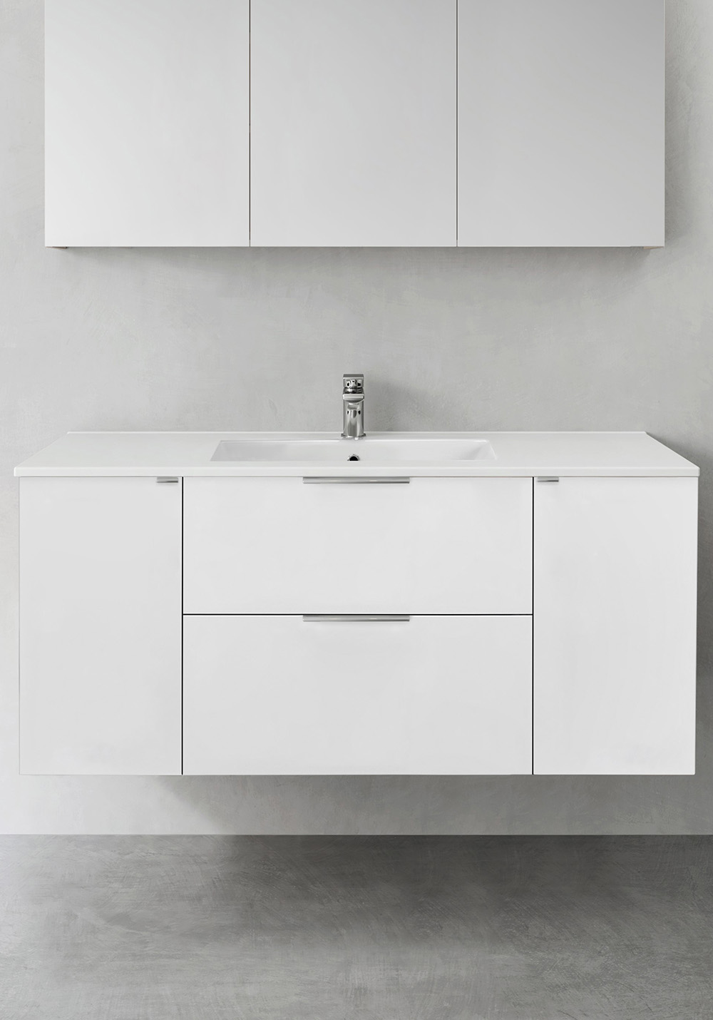Pehmeästi sulkeutuviin laatikoihin on helppo pääsy kokonaan aukeavuuden vuoksi. Laatikkomatot ja bambu sisustus pitää pikkutavarat järjestyksessä. Kaluste toimitetaan koottuna ja asentaminen on helppoa säädettävän ripustinhelan avulla. Kaluste on mukautettu joko seinä- tai lattiaviemäröintiin. Yhdistämällä sivumoduulin kanssa tarjoutuu lisämahdollisuuksia joista löytyy sopiva kokonaisuus ihan jokaiseen kylpyhuoneeseen. Valitse joko upotettava posliini allas tai pöytälevylle asennettava malja-allas. Täydennä tyyliisi sopivalla vetimellä tai nupilla. Osta lisäksi allashana, pohjaventtiili, vesilukko, laatikonvalaistus ja pistorasia.
