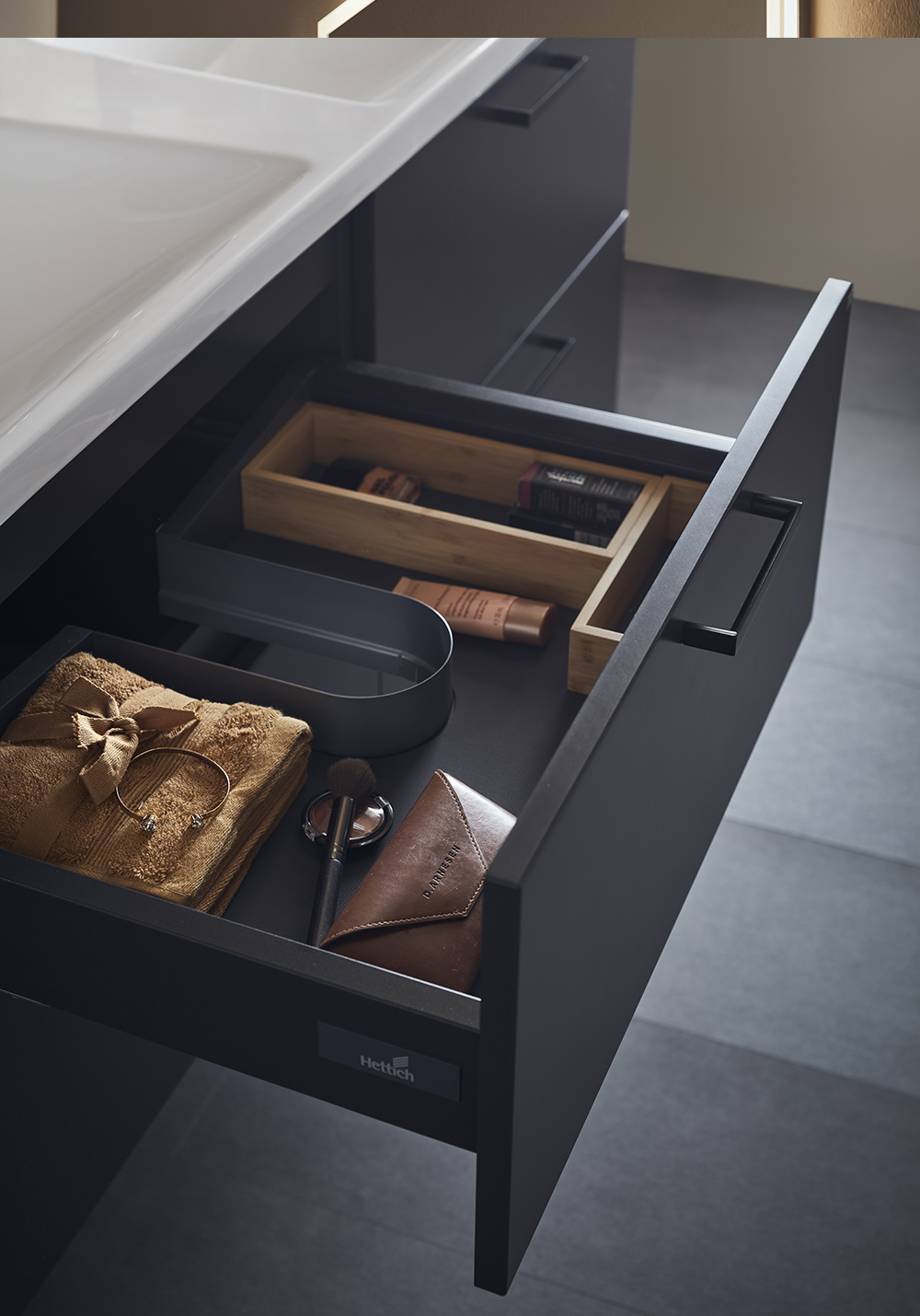Pehmeästi sulkeutuviin laatikoihin on helppo pääsy kokonaan aukeavuuden vuoksi. Laatikkomatot ja bambu sisustus pitää pikkutavarat järjestyksessä. Kaluste toimitetaan koottuna ja asentaminen on helppoa säädettävän ripustinhelan avulla. Kaluste on mukautettu joko seinä- tai lattiaviemäröintiin. Yhdistämällä sivumoduulin kanssa tarjoutuu lisämahdollisuuksia joista löytyy sopiva kokonaisuus ihan jokaiseen kylpyhuoneeseen. Valitse joko upotettava posliini allas tai pöytälevylle asennettava malja-allas. Täydennä tyyliisi sopivalla vetimellä tai nupilla. Osta lisäksi allashana, pohjaventtiili, vesilukko, laatikonvalaistus ja pistorasia.