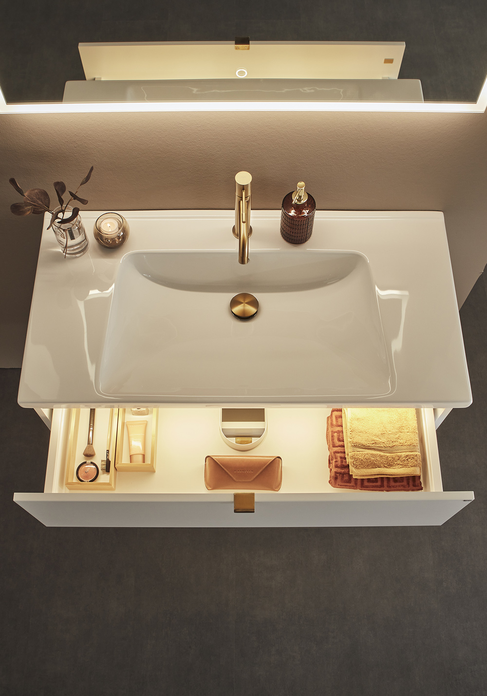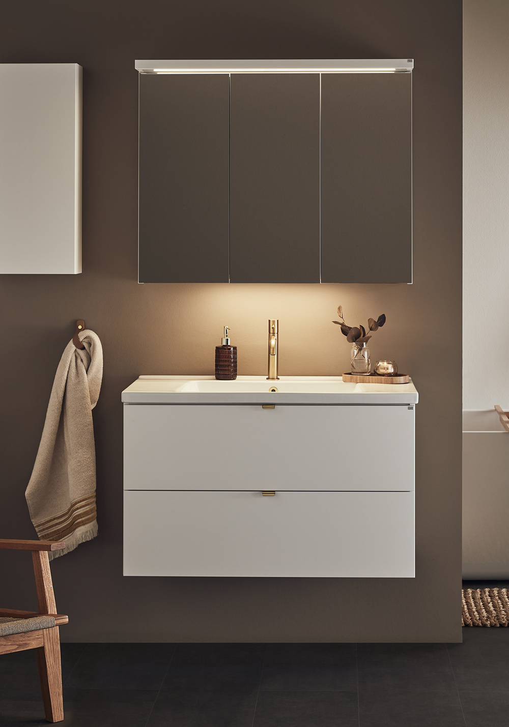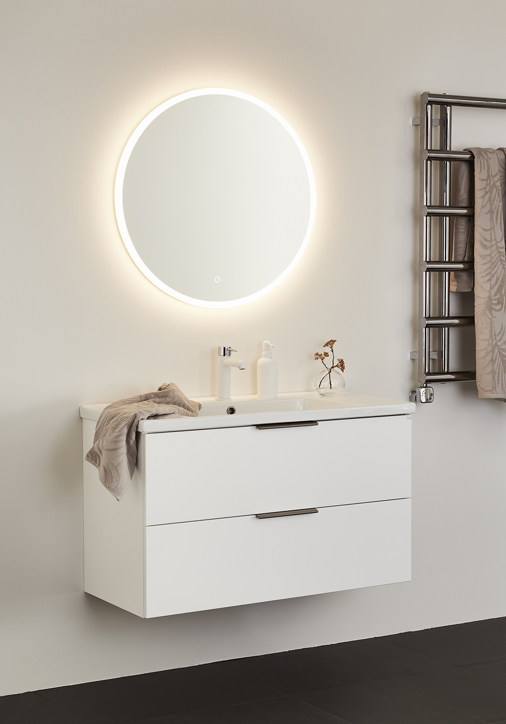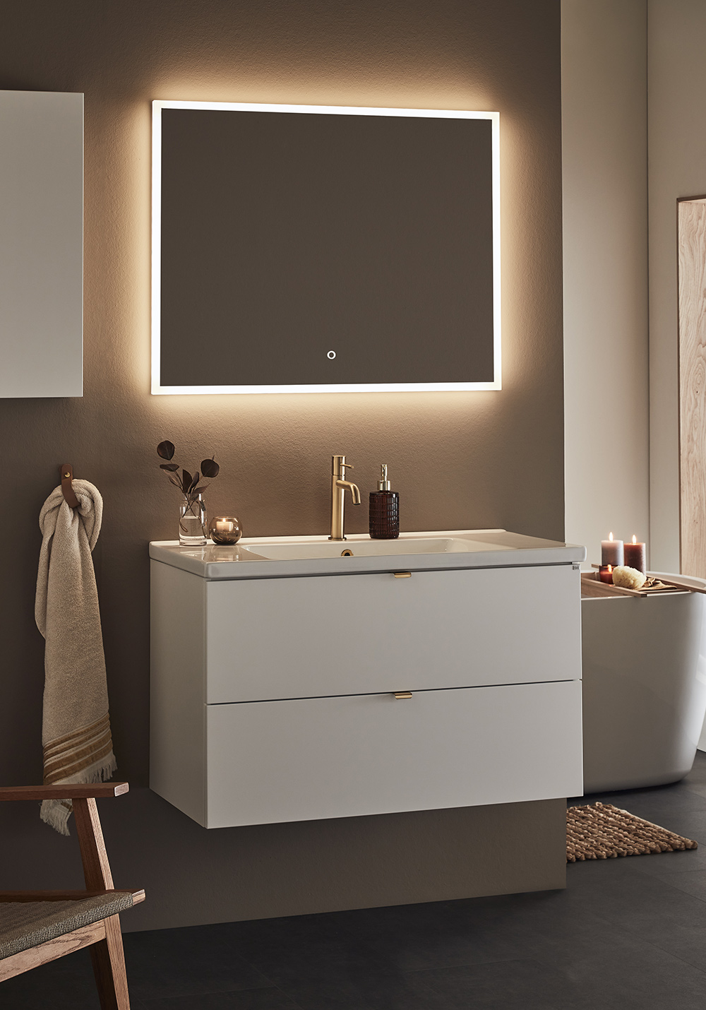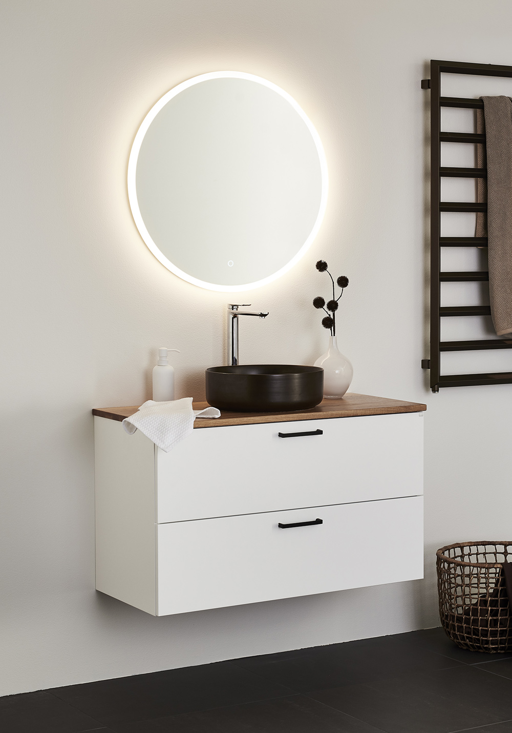 Pehmeästi sulkeutuviin laatikoihin on helppo pääsy kokonaan aukeavuuden vuoksi. Laatikkomatot ja bambu sisustus pitää pikkutavarat järjestyksessä. Kaluste toimitetaan koottuna ja asentaminen on helppoa säädettävän ripustinhelan avulla. Kaluste on mukautettu joko seinä- tai lattiaviemäröintiin. Yhdistämällä sivumoduulin kanssa tarjoutuu lisämahdollisuuksia joista löytyy sopiva kokonaisuus ihan jokaiseen kylpyhuoneeseen. Valitse joko upotettava posliini allas tai pöytälevylle asennettava malja-allas. Täydennä tyyliisi sopivalla vetimellä tai nupilla. Osta lisäksi allashana, pohjaventtiili, vesilukko, laatikonvalaistus ja pistorasia.