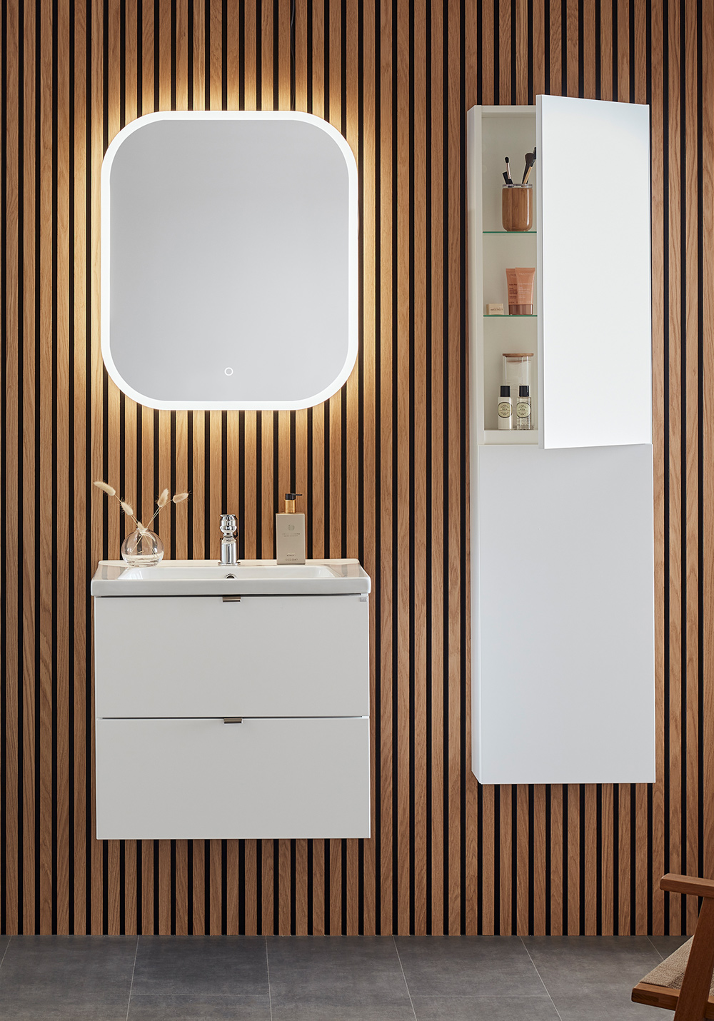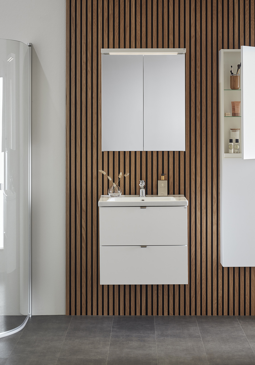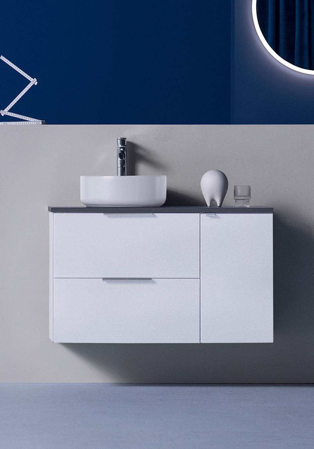 Pehmeästi sulkeutuviin laatikoihin on helppo pääsy kokonaan aukeavuuden vuoksi. Laatikkomatot ja bambu sisustus pitää pikkutavarat järjestyksessä. Kaluste toimitetaan koottuna ja asentaminen on helppoa säädettävän ripustinhelan avulla. Kaluste on mukautettu joko seinä- tai lattiaviemäröintiin. Yhdistämällä sivumoduulin kanssa tarjoutuu lisämahdollisuuksia joista löytyy sopiva kokonaisuus ihan jokaiseen kylpyhuoneeseen. Valitse joko upotettava posliini allas tai pöytälevylle asennettava malja-allas. Täydennä tyyliisi sopivalla vetimellä tai nupilla. Osta lisäksi allashana, pohjaventtiili, vesilukko, laatikonvalaistus ja pistorasia.