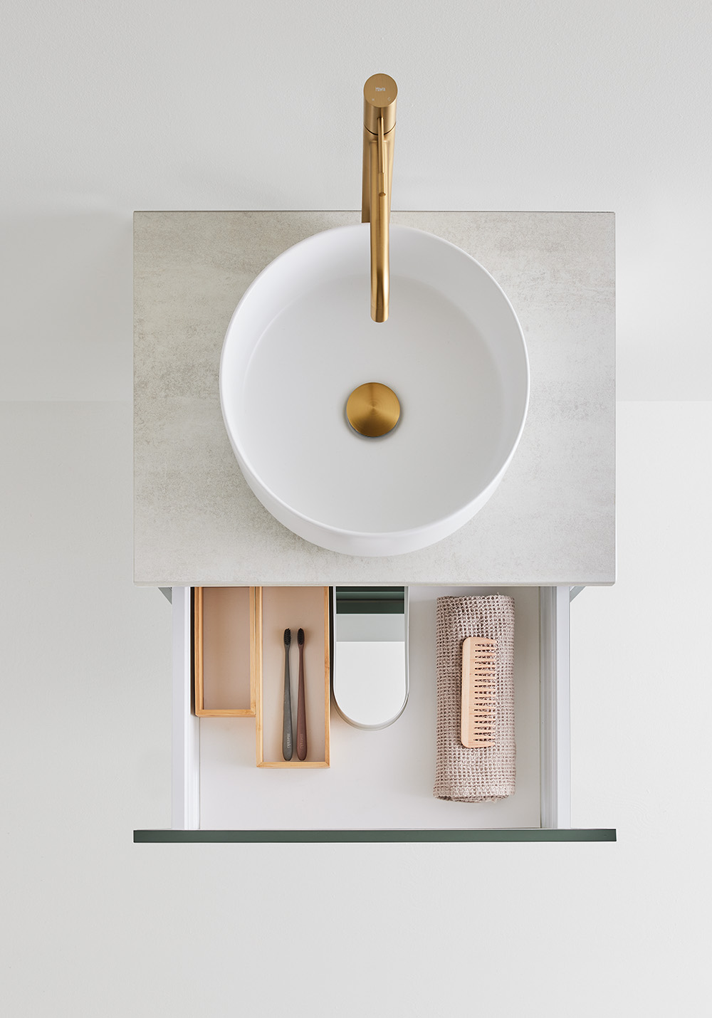 Pöytätaso on valmistettulaminaattipinnasta, jossa on vaalea kivikuvio ja mukana olevan posliini malja-altaan kaunis valkoinen mattapinta ja pyöreä muoto täydentää tyylin. Pehmeästi sulkeutuvat laatikot aukeavat kokonaan antaen hyvän yleisnäkymän sisältöön. Laatikkomatot ja kaksi bambukehystä auttavat pitämään pikkutavarat järjestyksessä. Allaskaappi on helppo asentaa seinäkiskon ja säädettävien ripustushelojen avulla. Siinä on myös valmius sekä seinä- että lattiaviemärille.