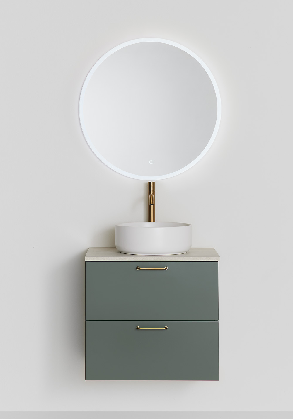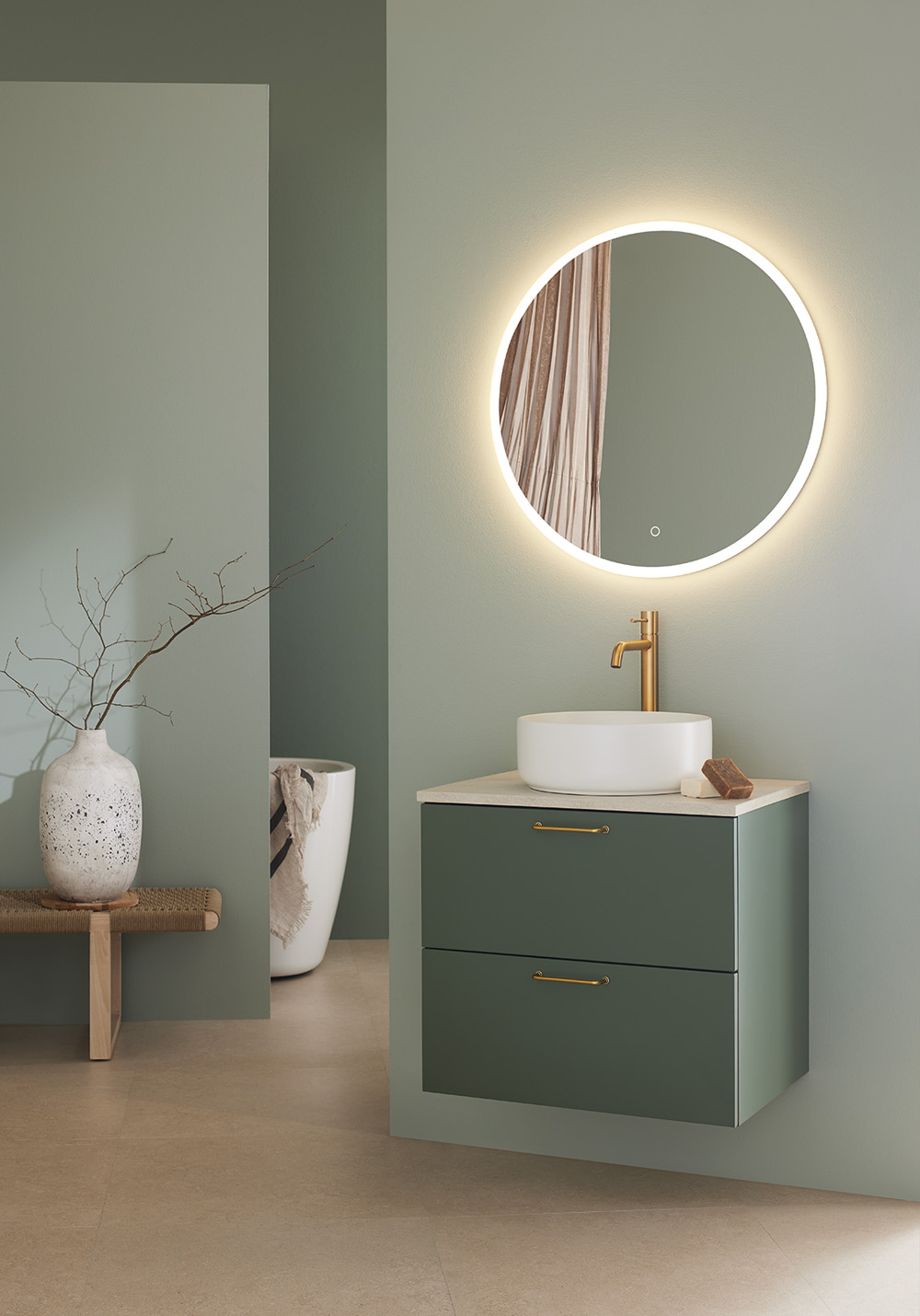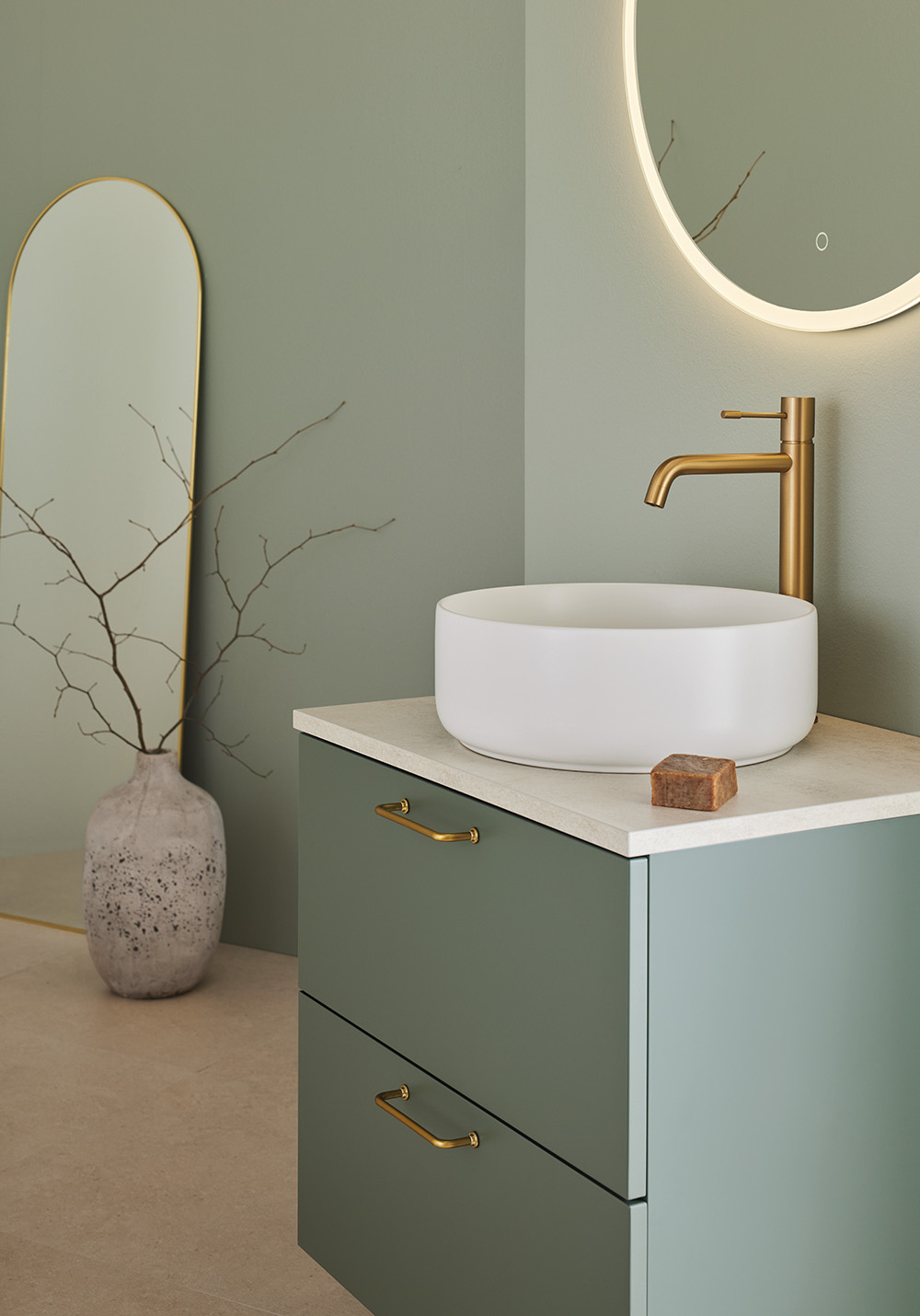 Kauniin vihreä Hafa Haze kylpyhuonekaluste pöytätasolla ja malja-altaalla muuttaa kylpyhuoneesi rauhalliseksi keitaaksi. Halusitpa sitten luoda kylpyhuoneen, joka tuo mieleen elinvoimaisen vehreyden tai tyylikkään ripauksen hienostunutta vihreää, on Haze varma ja tyylikäs valinta. Lisää vedin tai nuppi tyyliisi sopiviksi ja täydennä hanalla, pohjaventtiilillä ja vesilukolla.
