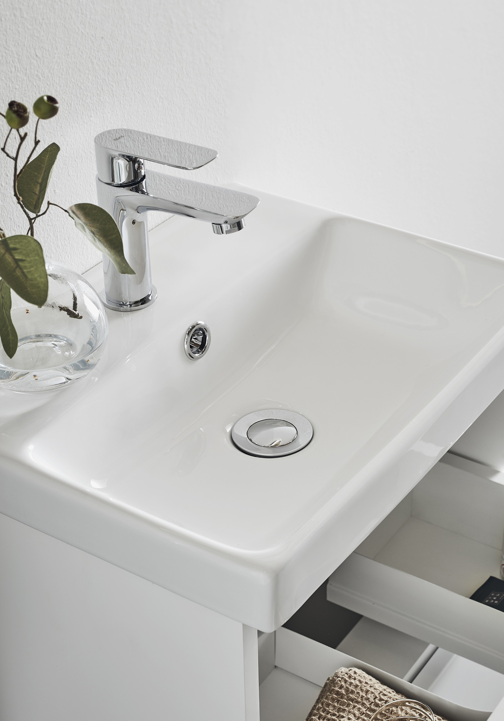 Hafa Neat on käytännöllinen siro pesuallaskaappi ylivuotosuojallisella posliinialtaalla. Kaapissa on pehmeästi sulkeutuva- toiminto ja asentaminen käy helposti seinäkiskon ja säädettävien ripustuksien ansiosta. Kaappi on valmisteltu seinä- tai lattiaviemäröinnille ja kaappi toimitetaan valmiiksi koottuna. Täydennä vetimillä, pohjaventtiilillä, ja vesilukolla. Suosittelemme tälle altaalle hanaa, jossa on virtausta säätelevä suutin.
