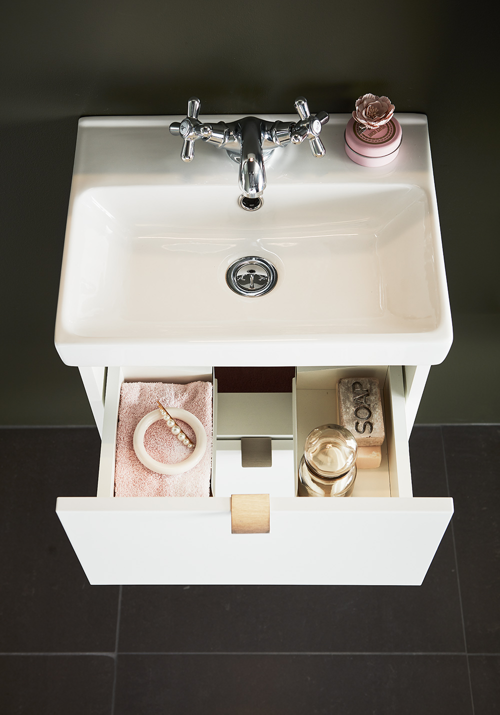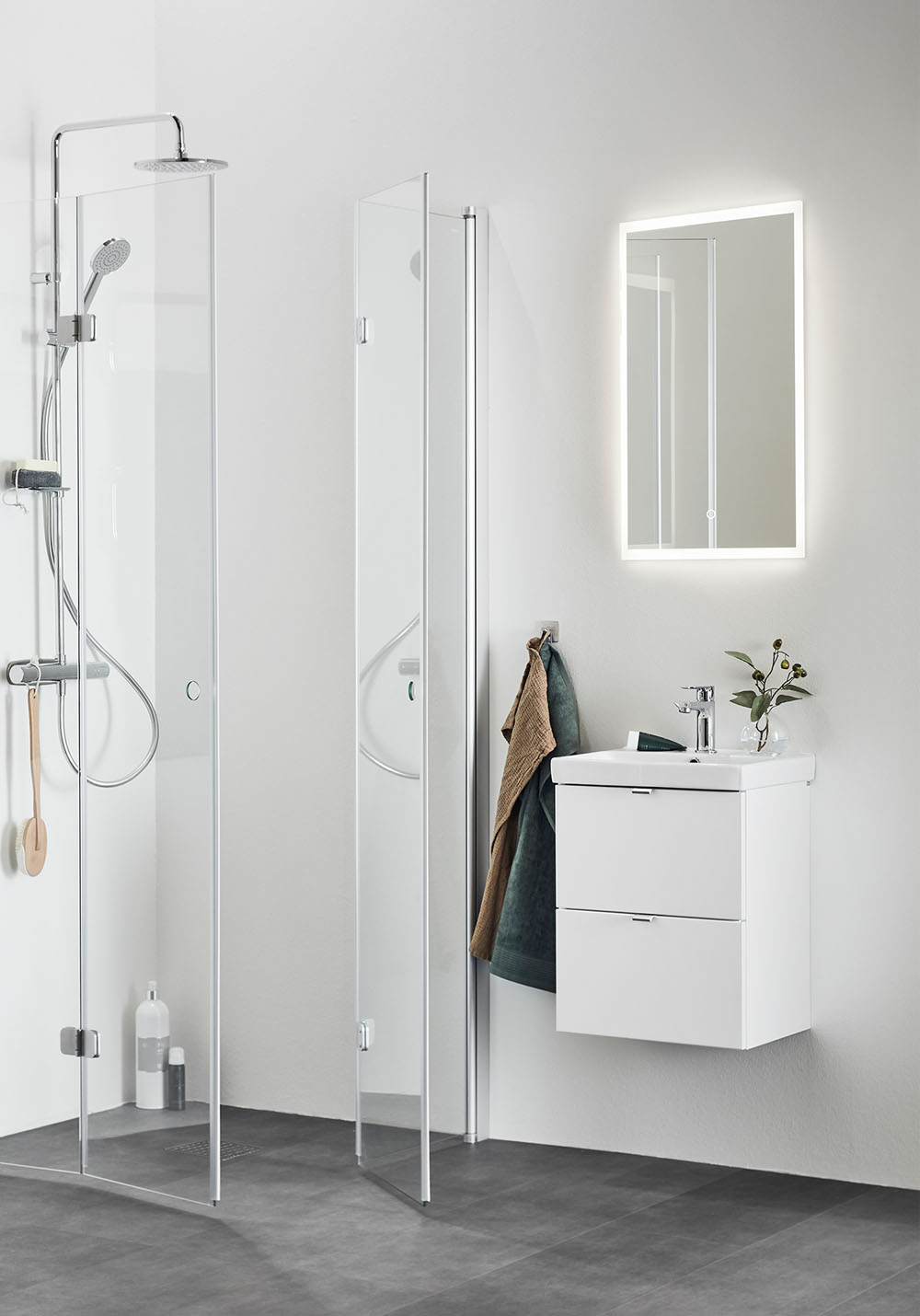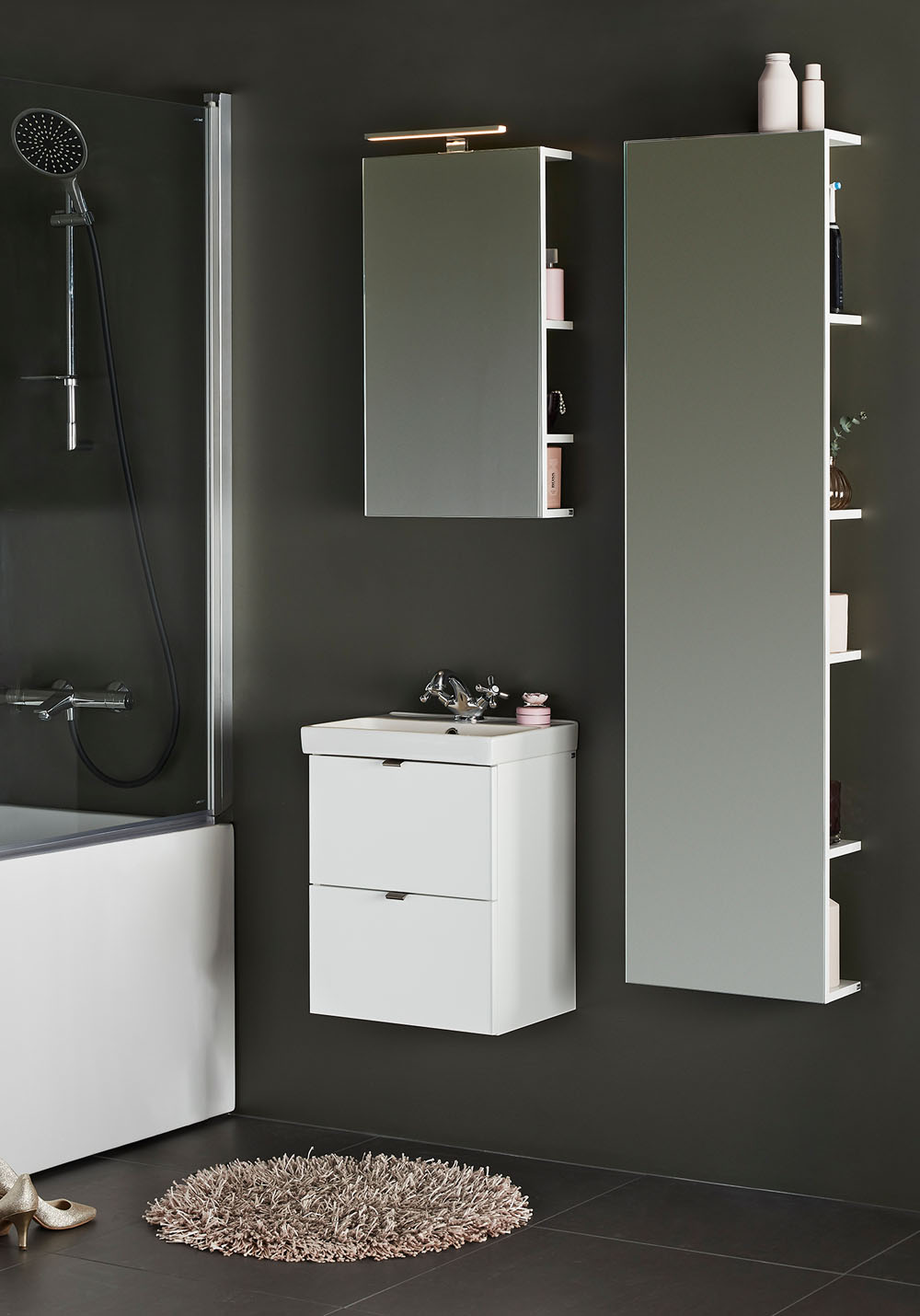 Hafa Neat on käytännöllinen siro pesuallaskaappi. Täydennä Hafa Neat posliini pesualtaalla. Kaapissa on pehmeästi sulkeutuva- toiminto ja asentaminen käy helposti seinäkiskon ja säädettävien ripustuksien ansiosta. Kaappi on valmisteltu seinä- tai lattiaviemäröinnille ja kaappi toimitetaan valmiiksi koottuna. Täydennä vetimillä, pohjaventtiilillä, ja vesilukolla. Suosittelemme tälle altaalle hanaa, jossa on virtausta säätelevä suutin.