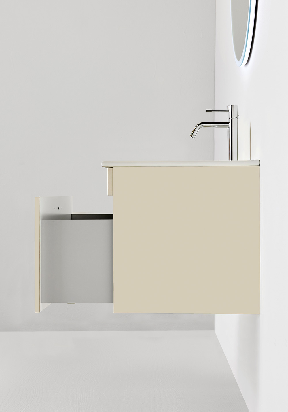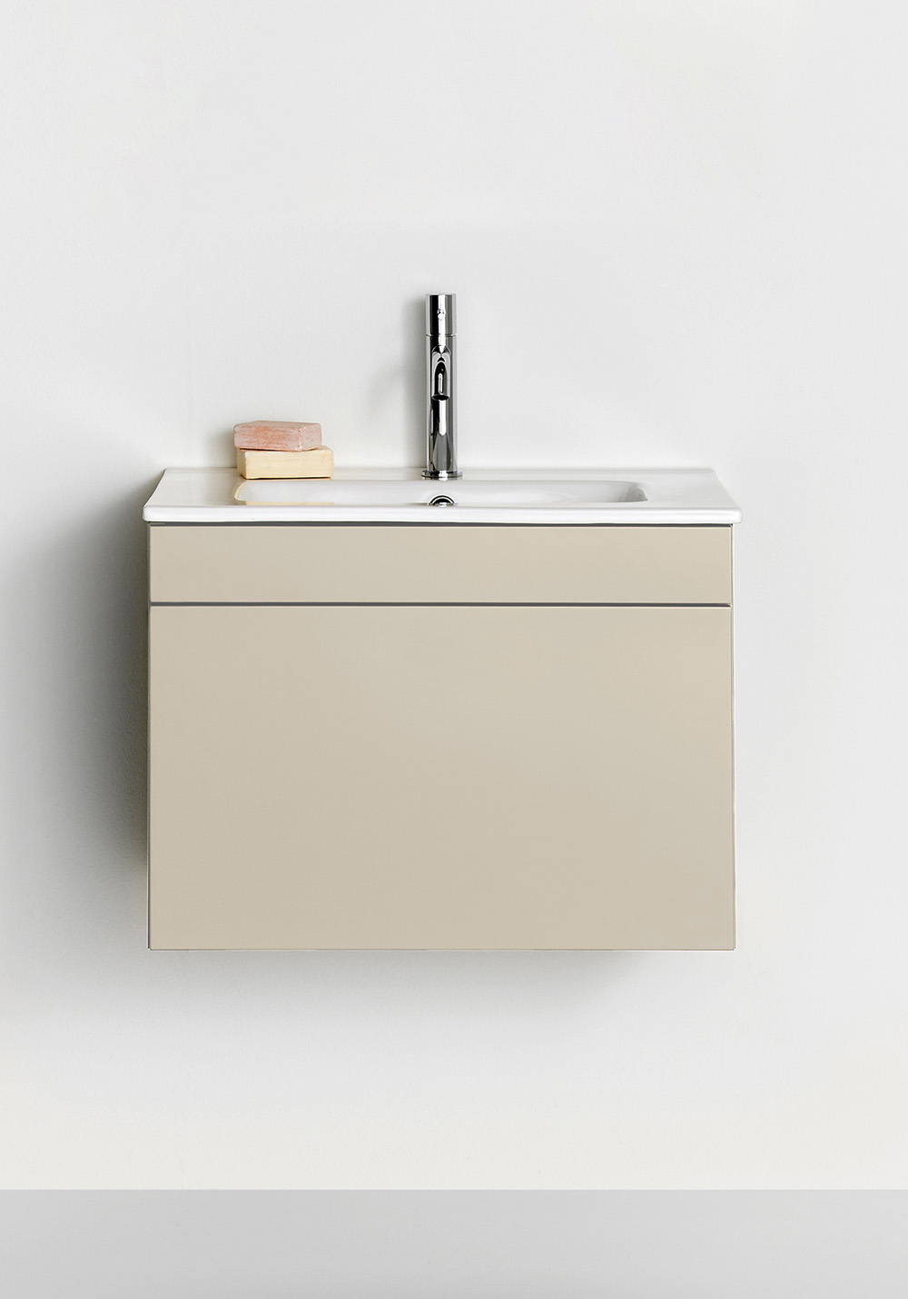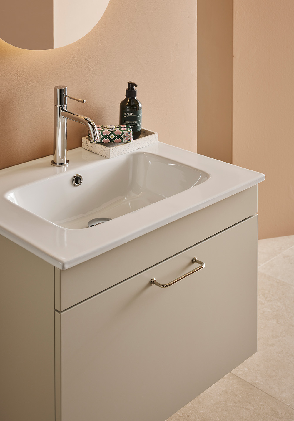 Pesuallaskaappi Hafa Sand luo pehmeän ja rauhallisen tunnelman kauniilla beige värillään ja pelkistetyllä muotoilullaan. Pehmeästi sulkeutuva laatikko tarjoaa reilusti säilytystilaa.