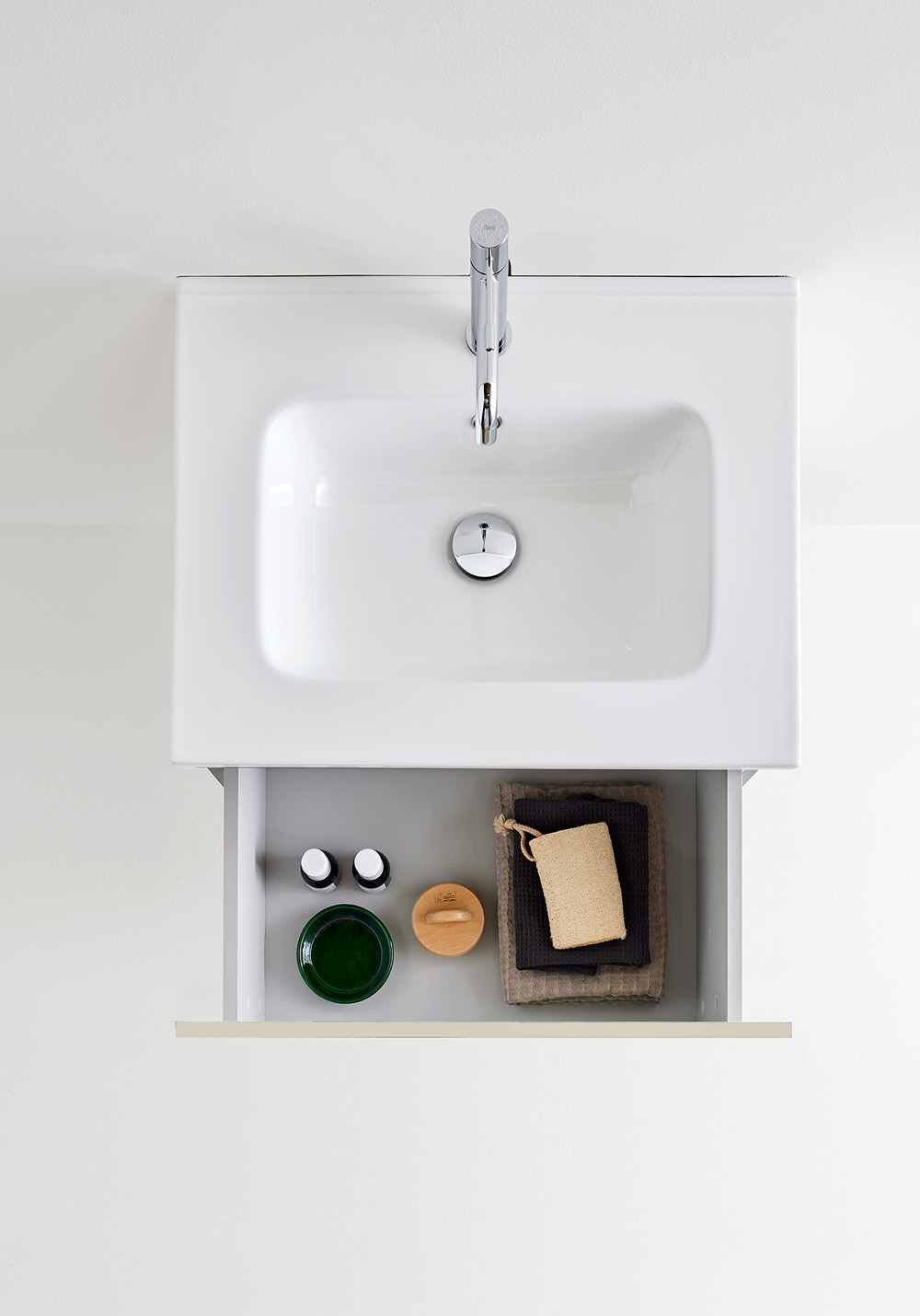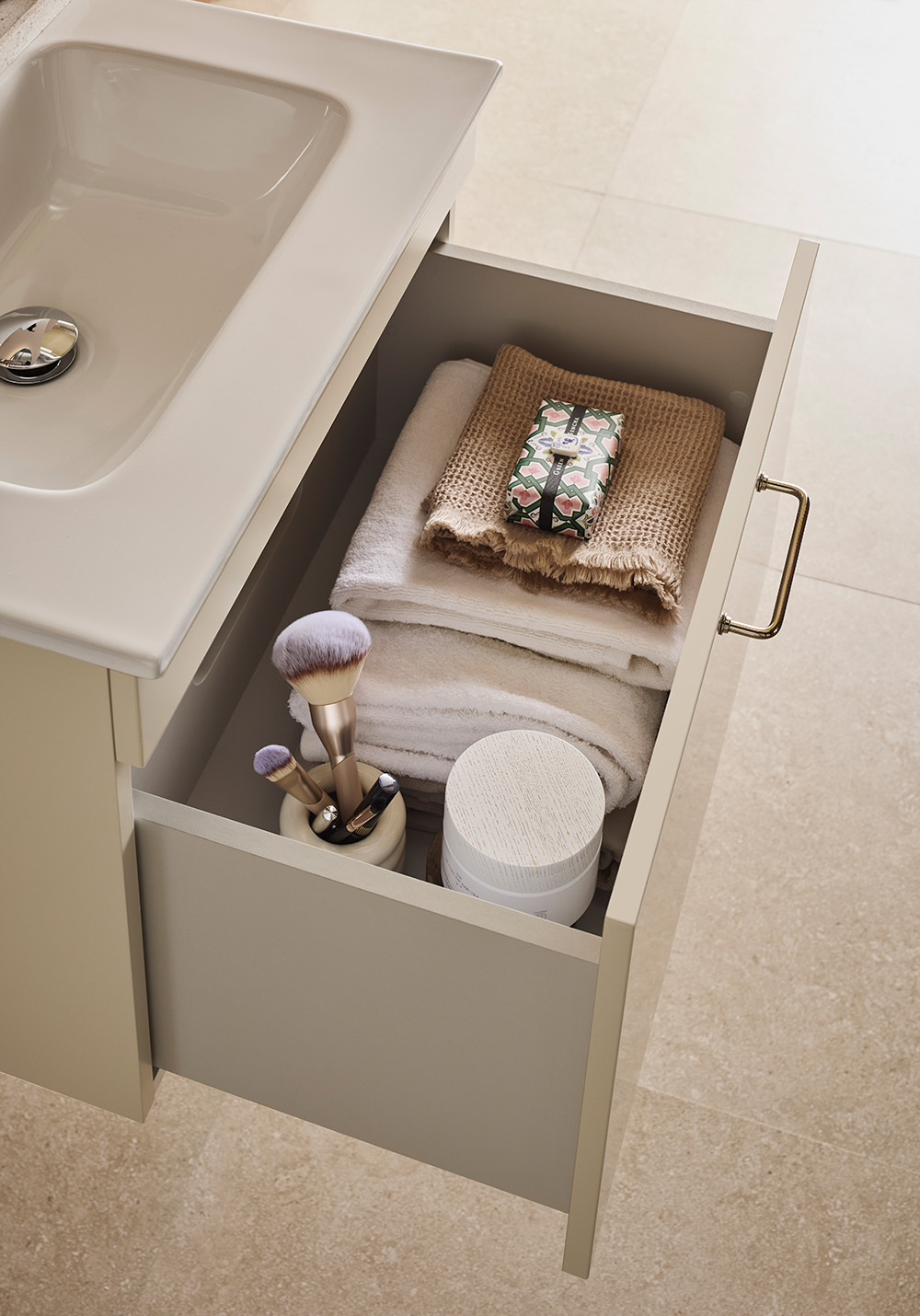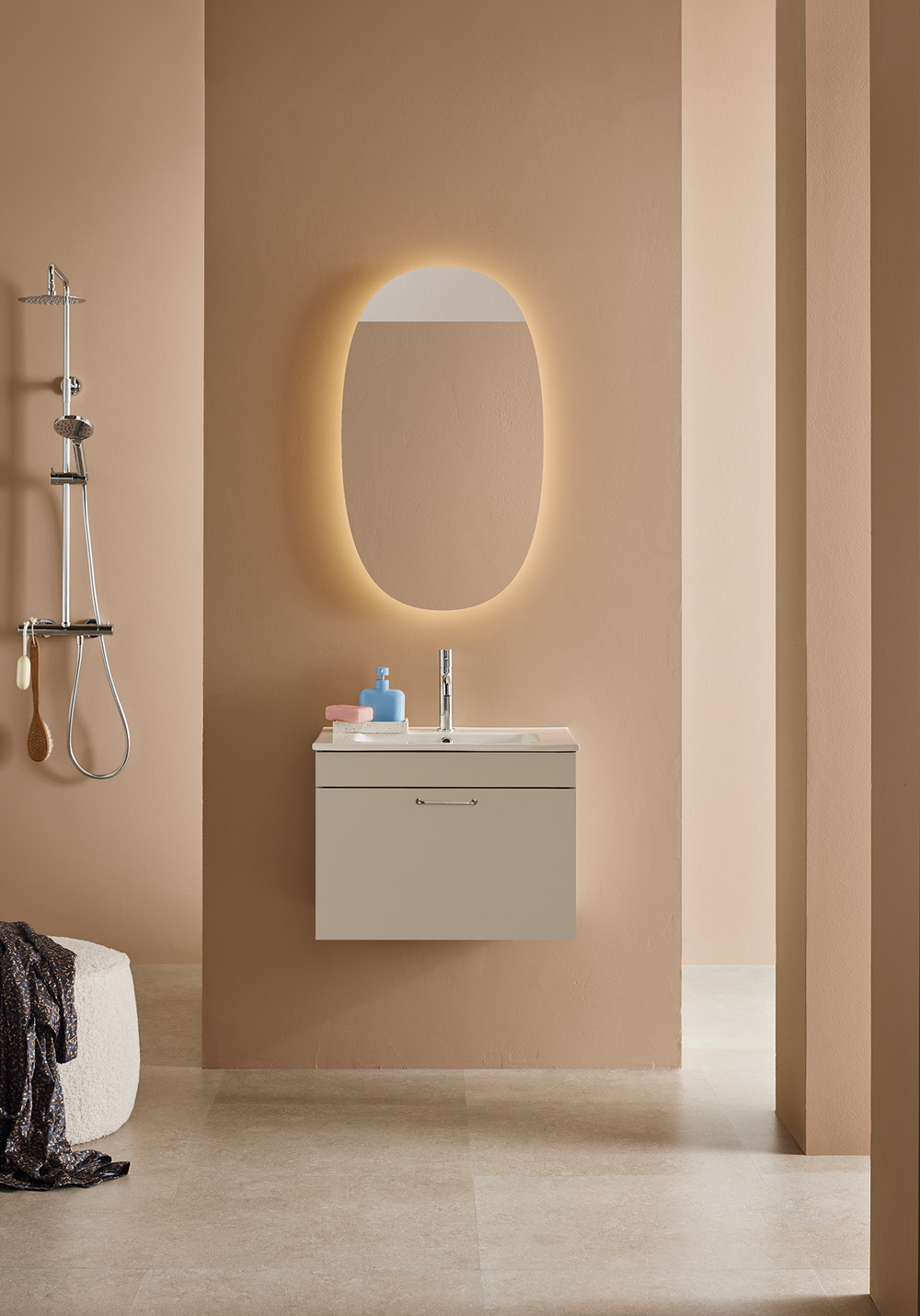 Pesuallaskaappi Hafa Sand luo pehmeän ja rauhallisen tunnelman kauniilla beige värillään ja pelkistetyllä muotoilullaan. Pehmeästi sulkeutuva laatikko tarjoaa reilusti säilytystilaa.