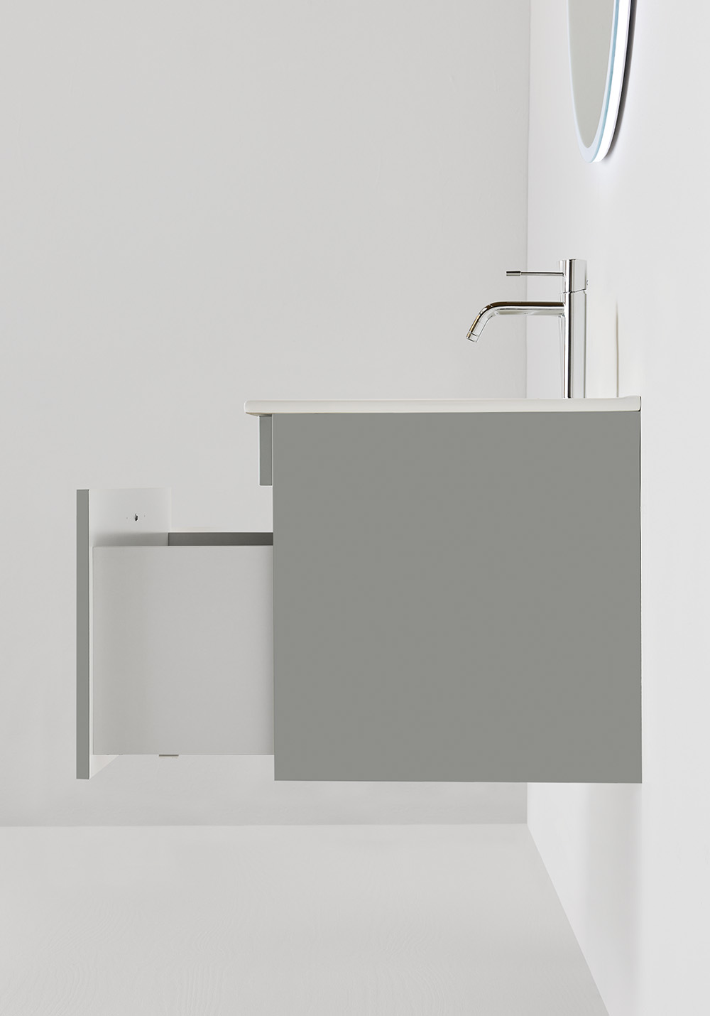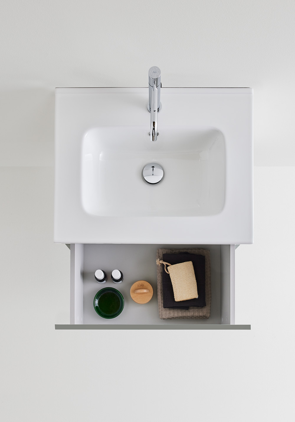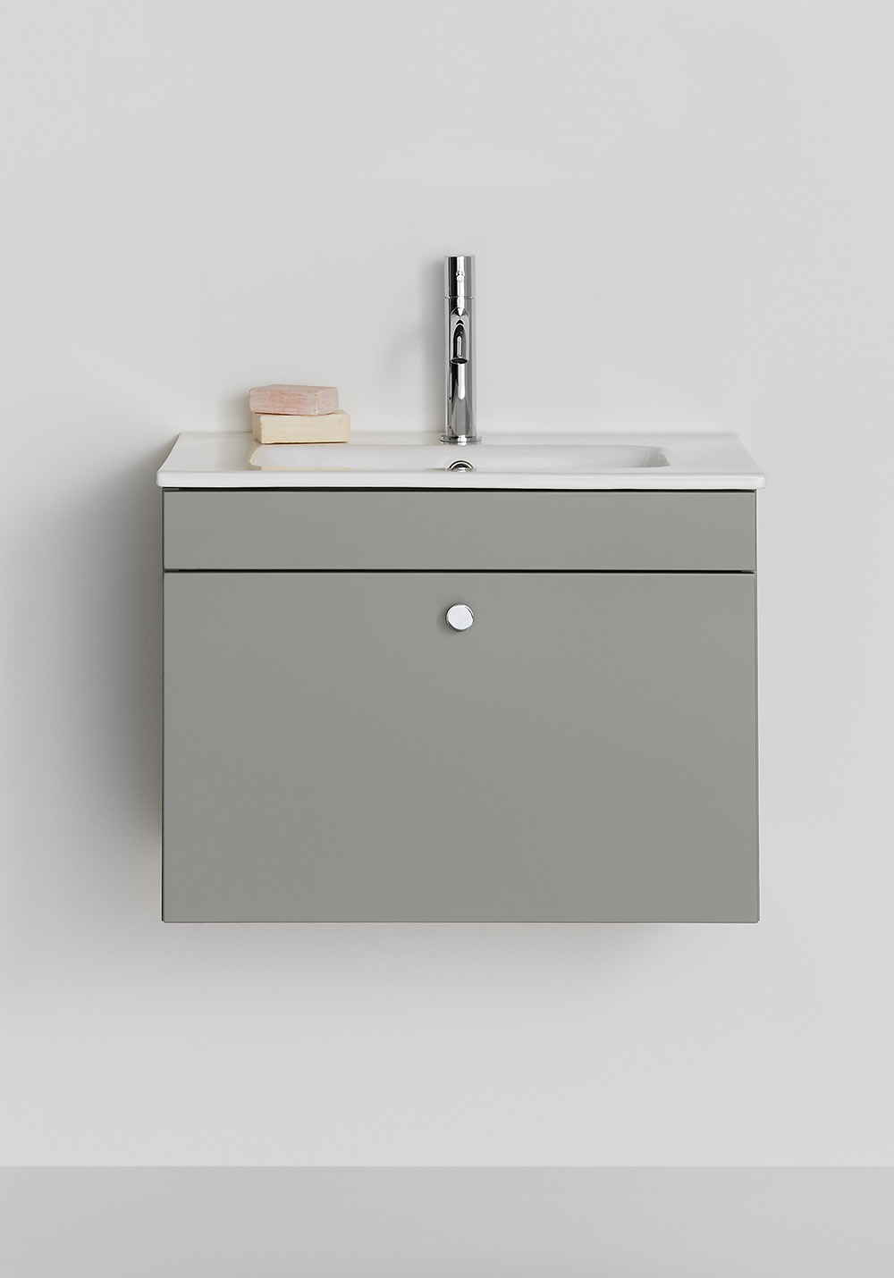 Posliinisessa pesualtaassa on pehmeästi muotoiltu allas ja reilut laskutilat sekä ylivuotosuoja. Pehmeästi sulkeutuva laatikko, jossa on runsaasti säilytystilaa. Allaskaappi on helppo asentaa seinäkiskon ja säädettävien ripustushelojen avulla. Se on myös valmisteltu sekä seinä- että lattiaviemäriä varten.