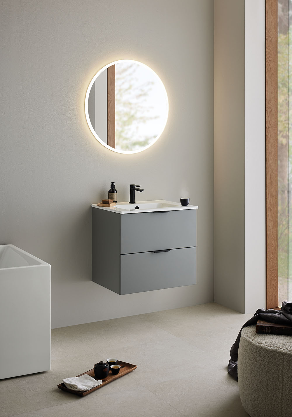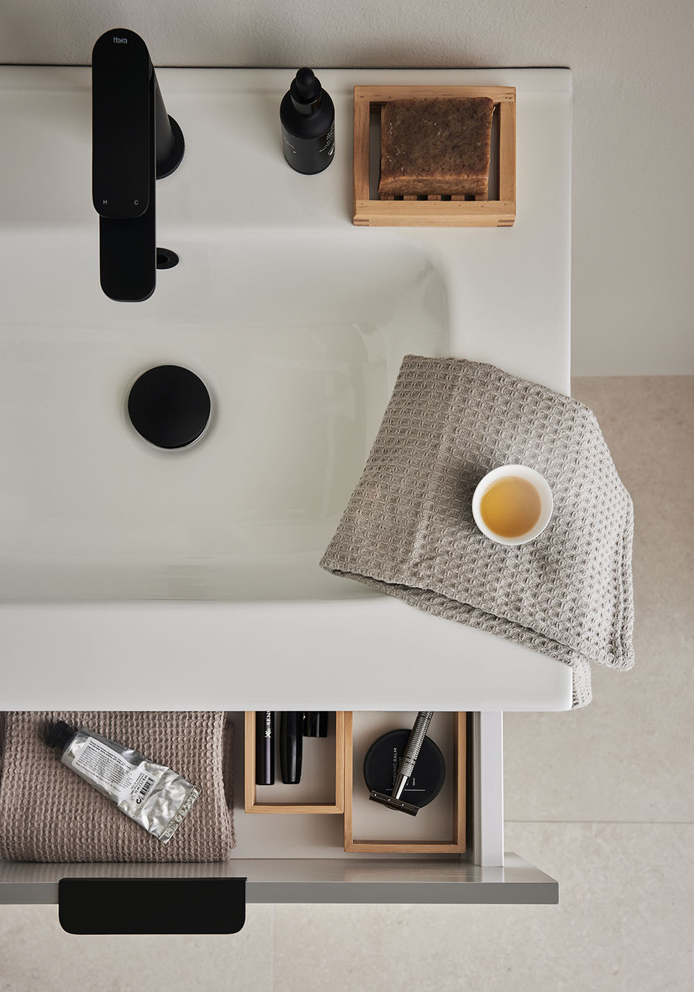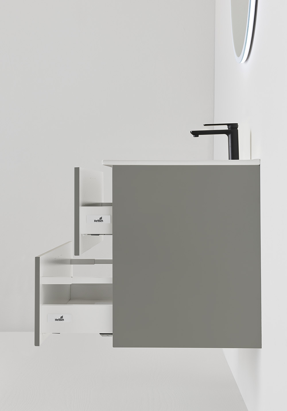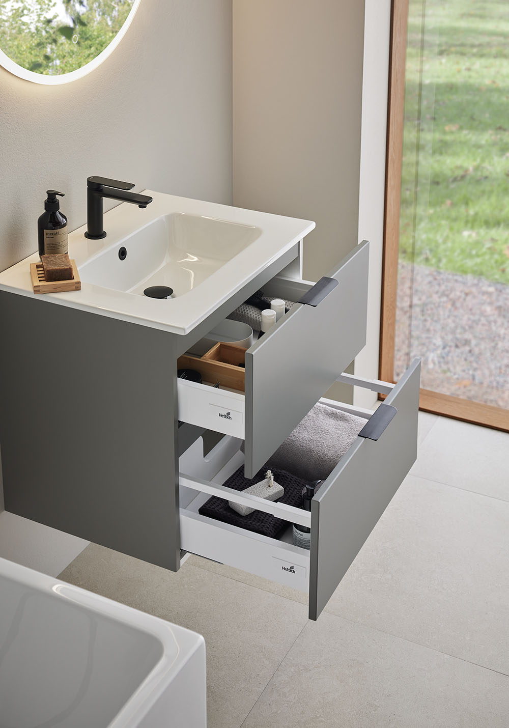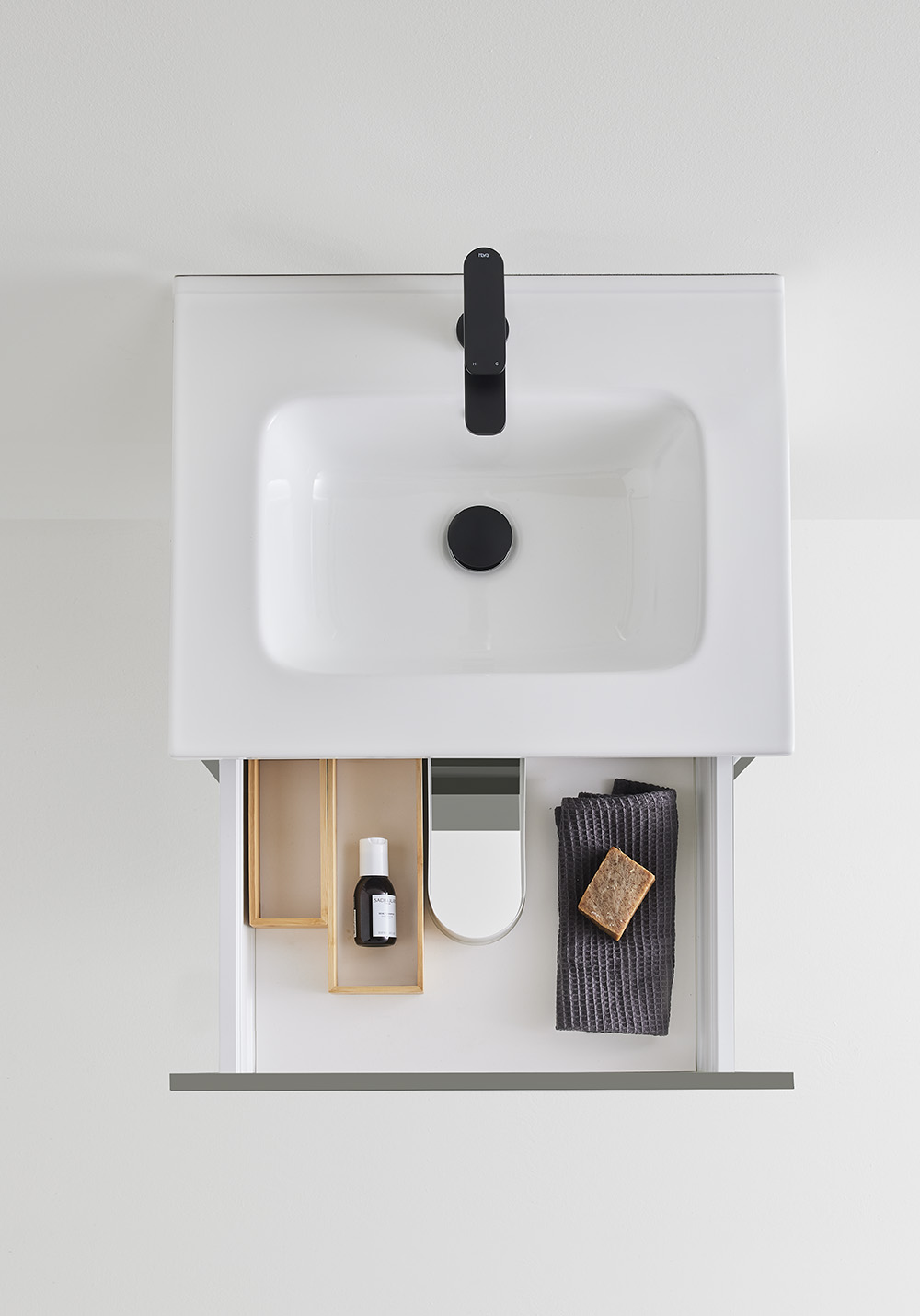Posliinisessa pesualtaassa on pehmeästi muotoiltu allas ja reilut laskutilat sekä ylivuotosuoja. Pehmeästi sulkeutuvat laatikot aukeavat kokonaan antaen hyvän yleisnäkymän sisältöön. Laatikkomatot ja kaksi bambukehystä auttavat pitämään pikkutavarat järjestyksessä. Allaskaappi on helppo asentaa seinäkiskon ja säädettävien ripustushelojen avulla. Siinä on myös valmius sekä seinä- että lattiaviemärille.