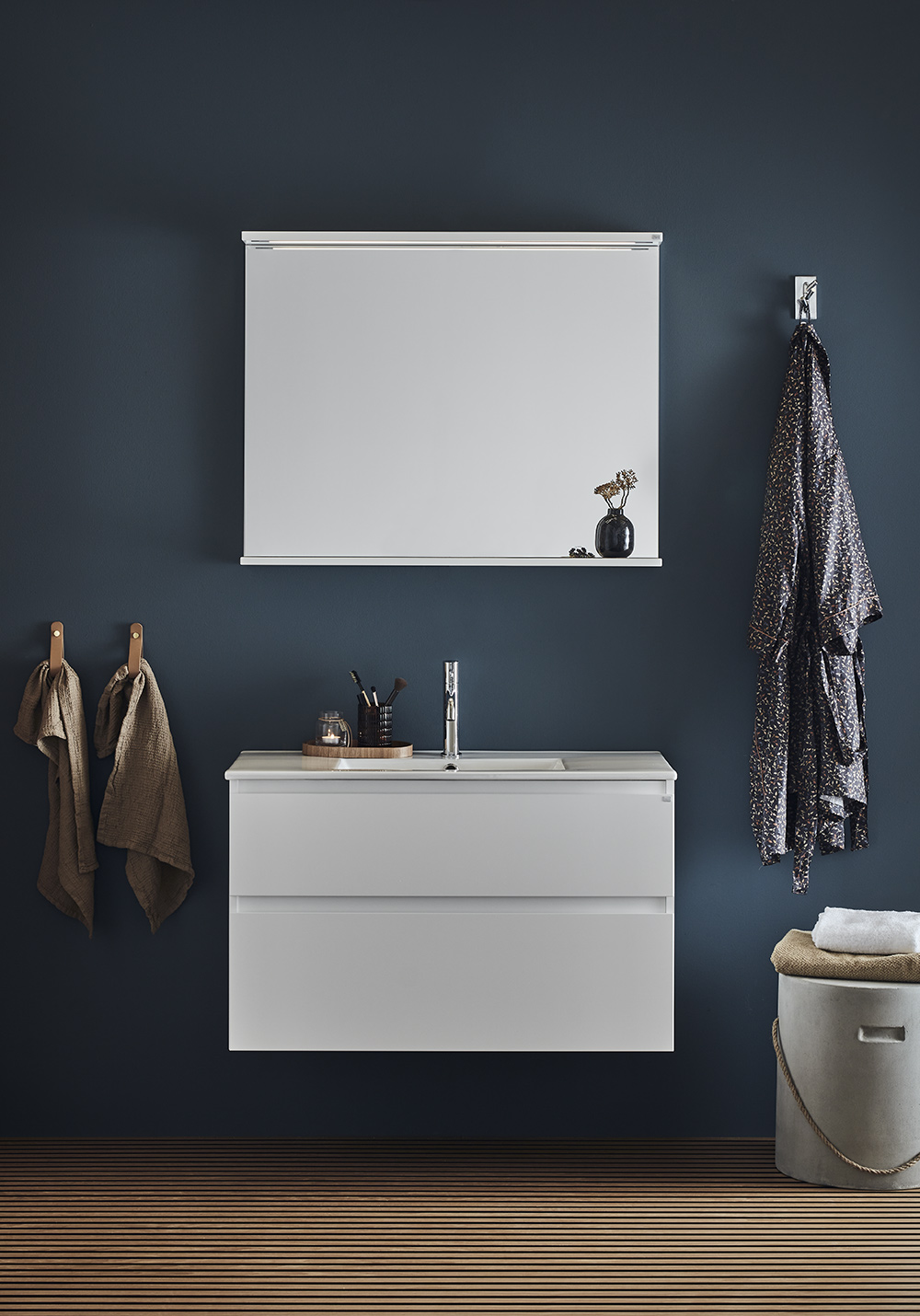 Pesuallaskaappi Hafa Style matta valkoinen on integroiduilla vetimillä, joka antaa kalusteelle tyylikkään muotoilun. Kahdessa pehmeästi sulkeutuvassa laatikossa on laatikkomatot ja laatikot aukeavat kokonaan, joten pääset helposti käsiksi niiden sisältöön. Osta mukaan pesuallas, hana, pohjaventtiili, vesilukko, sähköpistorasia.