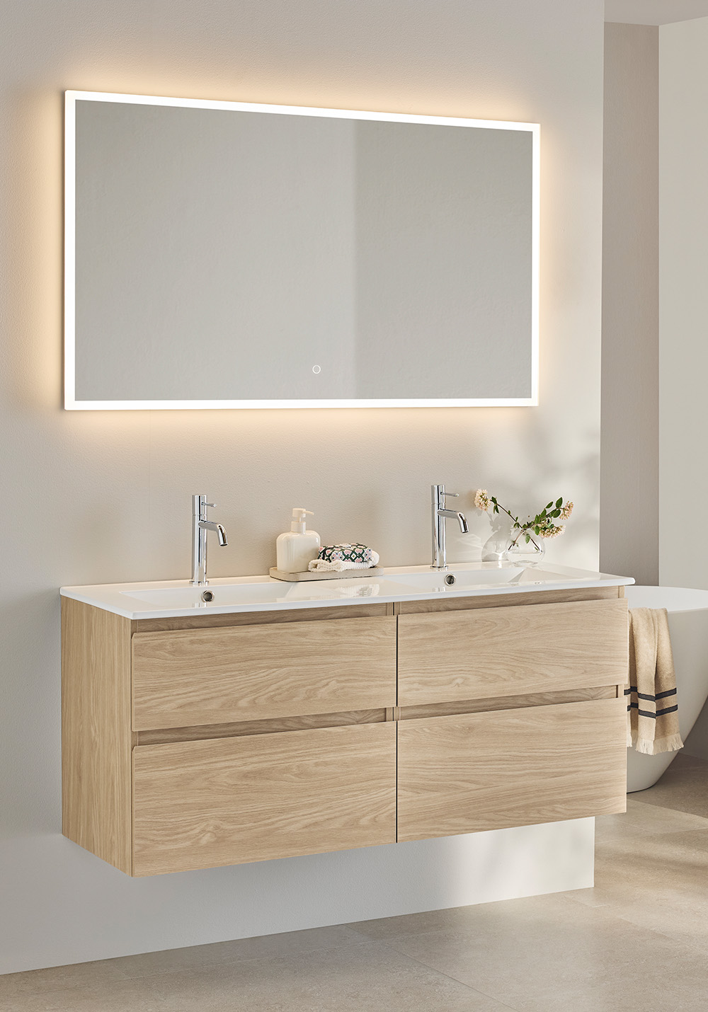 Pesuallaskaappi Hafa Style tammi on integroiduilla vetimillä, joka antaa kalusteelle tyylikkään muotoilun. Kahdessa pehmeästi sulkeutuvassa laatikossa on laatikkomatot ja laatikot aukeavat kokonaan, joten pääset helposti käsiksi niiden sisältöön. Osta mukaan pesuallas, hana, pohjaventtiili, vesilukko, sähköpistorasia.