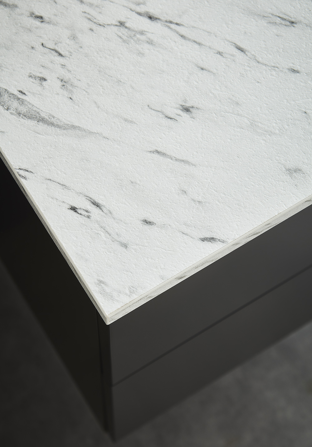 OnTop laminaatti pöytätaso. Marmorikuvio. Reiät porataan asennusvaiheessa hanalle, altaalle ja niiden sijainnille sopivaksi.