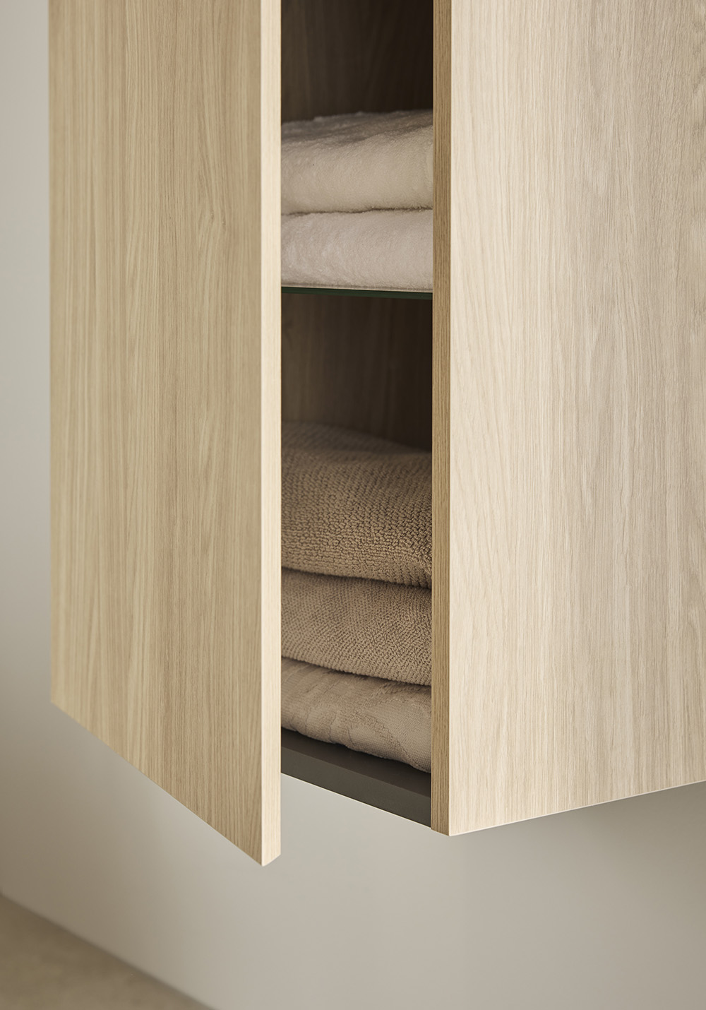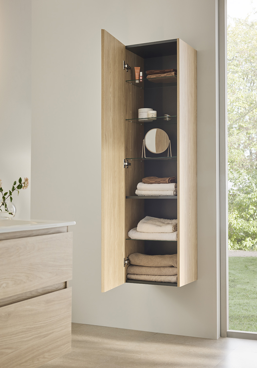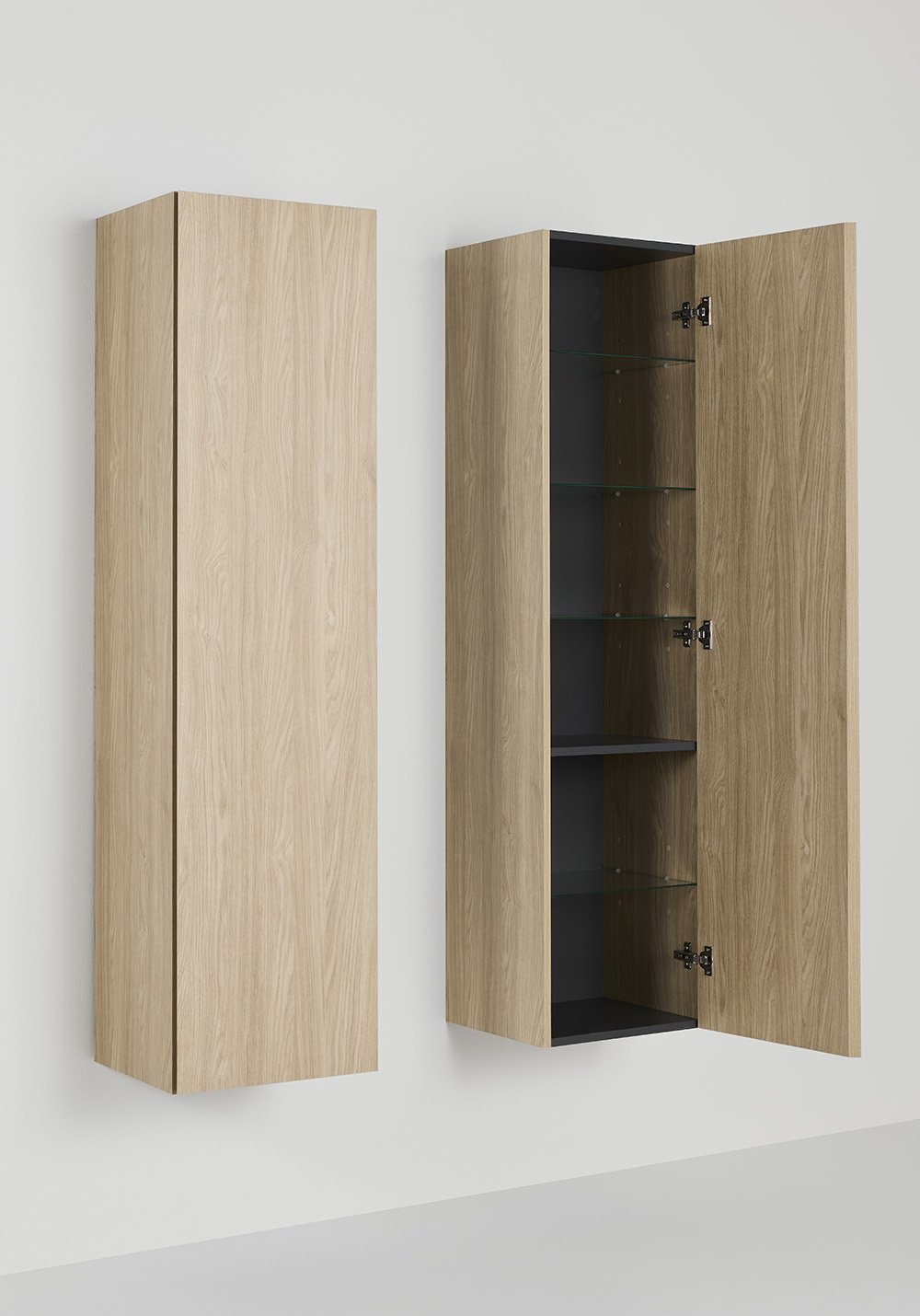 Korkeakaappi Hafa Style tammi on kauniilla kuvioidulla pinnallaan ja integroidulla vetimellä tyylikäs ja modernin ilmeen antava kaappi. Kaapin tilavuus on sovitettu taitetuille kylpypyyhkeille. Yksi kiinteä hylly sekä neljä lasi hyllyä, joissa on säädettävä korkeus ja kiinteät hyllytuet. Kaappi on täysin koottu ja se on helppo asentaa seinään kiskoon avulla. Ovi voidaan asentaa oikealle tai vasemmalle puolelle. Osta mukaan pistorasia 126 72 65.