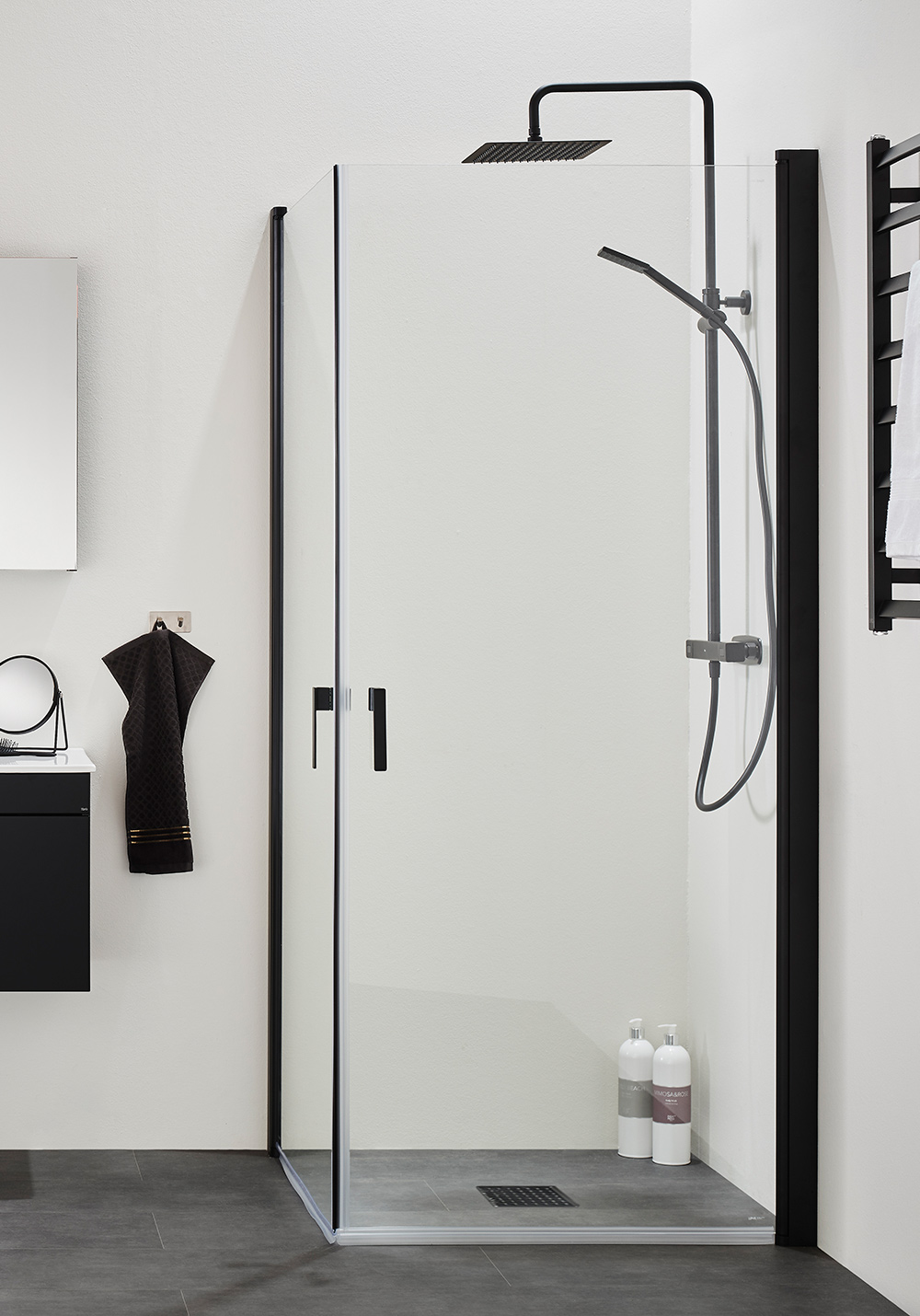 Tilava suihkunurkka suorilla ovilla kirkasta lasia. Profiilit ja vetimet joko matta mustana tai alumiinin värisenä. Ovet voidaan kääntää sisäänpäin, kun suihkua ei käytetä tilan säästämiseksi. Suihkunurkka on jämäkkä ja seinäprofiilit voidaan asentaa joko ruuvaamalla tai liimaamalla seinään. Patentoitu Hafa InstaQuick™ helppoon ja yksinkertaiseen asennukseen. Ovien nostosaranat ovat käännettävissä ja estävät ovia ottamasta kiinni lattiaan, kun ovia avataan. 6 mm karkaistua turvalasia. Korkeus 2000 mm. Voidaan asentaa pintaasennetuille putkille, 35 mm. 22 mm laahuslista, magneettilistat sekä vetimet kuuluvat mukaan.
