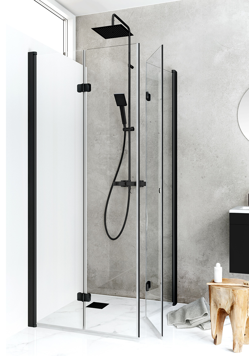 Suihkunurkka kirkaslasisilla taitettavilla ovilla vapauttaa enemmän tilaa ja antaa mahdollisuuden toteuttaa järkevän suihkuratkaisun tilaan minne perinteinen suihkunurkka voi olla vaikea saada mahtumaan. Taitettava ovi käännetään helposti seinää vasten silloin kun suihkua ei käytetä ja antaa järkevän suihkuratkaisun tilaan missä WC tai kalusteet tekevät tilasta ahtaan. Suihkunurkan vakaat profiilit ovat joko hapetettuja tai mustaksi lakattua alumiinia ja ne voidaan asentaa joko ruuveilla tai liima-alustoilla. Asentaminen ja säätö on helppoa patentoidun Hafa InstaQuick™- ratkaisun avulla. Suihkuovien nostosaranoiden ansiosta eivät ovet ota kiinni lattiaan avattaessa/suljettaessa ja ne ovat käännettävät. Suihkuovet voidaan yhdistellä muiden IglooPro-sarjan ovien ja seinien kanssa. 6 mm karkaistua turvalasia. Korkeus 2000 mm. Voidaan asentaa pintaanasennettujen putkien kanssa, 35 mm. 22 mm laahuslista, magneettilista sekä vedin kuuluu mukaan.