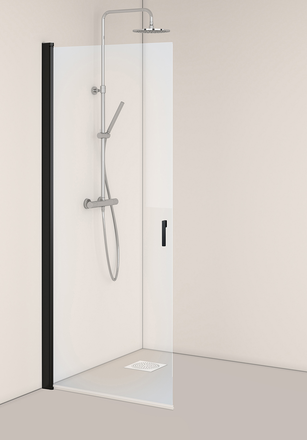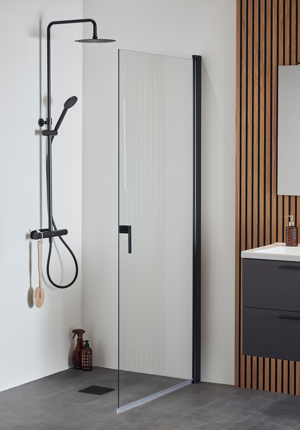 - Nopeasti asennettava kääntyvä suora suihkuovi, matta musta tai aluminium profiili