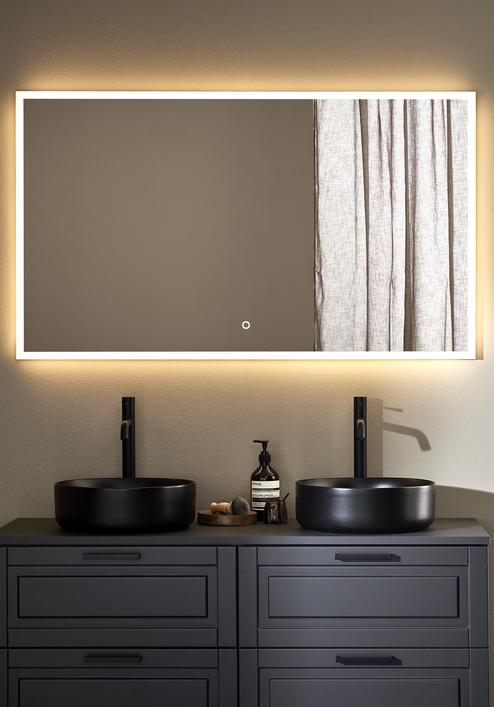 Tyylipuhtaassa suorakulmaisessa peilissä on himmennettävä valo peilin ympäri. Koristeellista ja toimivaa lämpimänvalkoista LED-valaistusta säädellään kosketustoiminnolla. Viimeisin valoasetus pysyy muistissa sammutettaessa ja päälle laitettaessa. IP44.