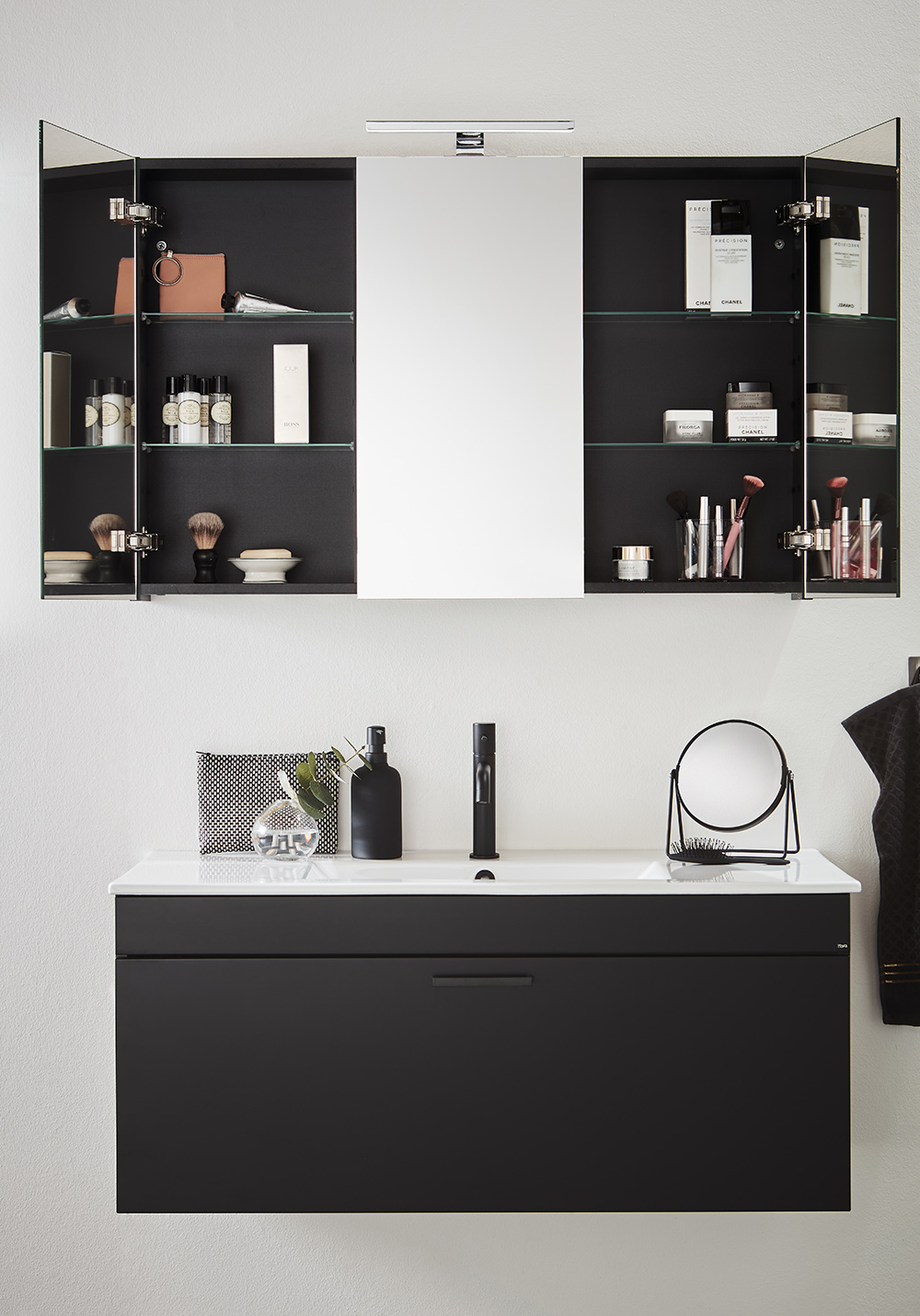 Hafa Go -peilikaappi tarjoaa reilusti käytännöllistä säilytystilaa. Peiliovet ovat kaksipuoleiset ja lasihyllyjen korkeutta voidaan säätää tarpeiden mukaiseksi. Peilikaapin asennus käy helposti yhden henkilön toimesta seinälle asennettavan kiskon avulla. Saatavana useissa eri leveyksissä ja väreissä. Osta mukaan Go LED-valaisin 1267270 ja pistorasia 1267265.