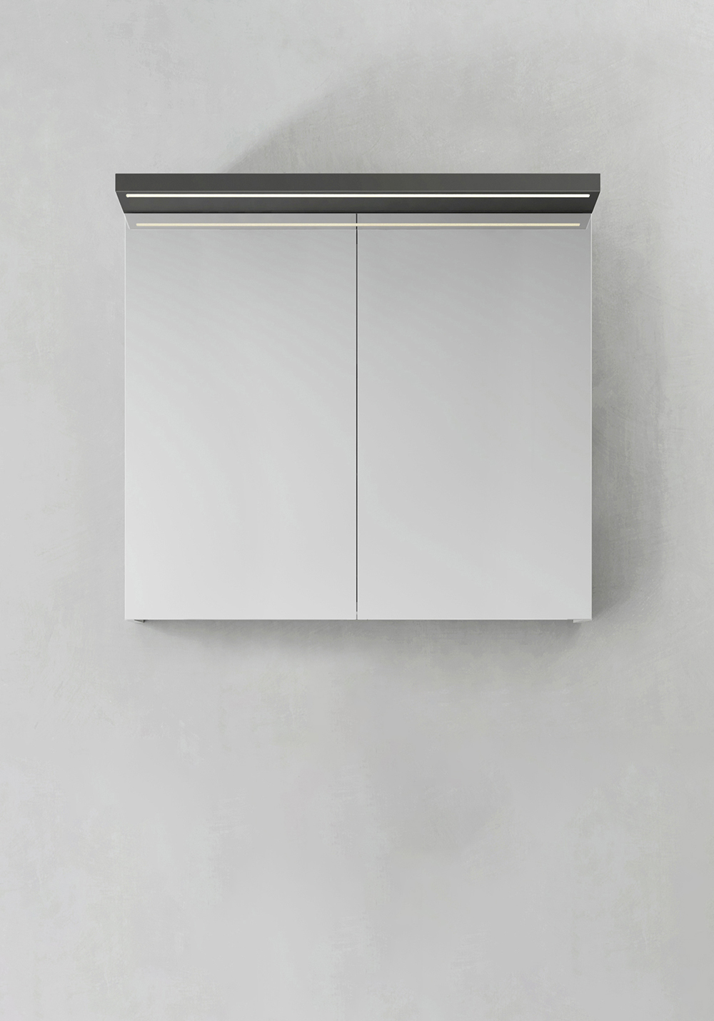 Peilikaappi, jossa käytännöllinen valaistus upotetulla LED-profiililla tai lämpimän valkoisella LED-kohdevalaisimilla. Pehmeästi sulkeutuvat molemminpuoliset peiliovet. Pistorasia sisällä oikealla puolella ja irrotettavat lasihyllyt hyllynkannattimilla, jotka lukitsevat ne varmasti paikoilleen. Helppo asentaa yksin kokonaisella kiinnityskiskolla ja säädettävillä ripustusheloilla. Valmisteltu helppoa sähköasennusta varten. IP44.